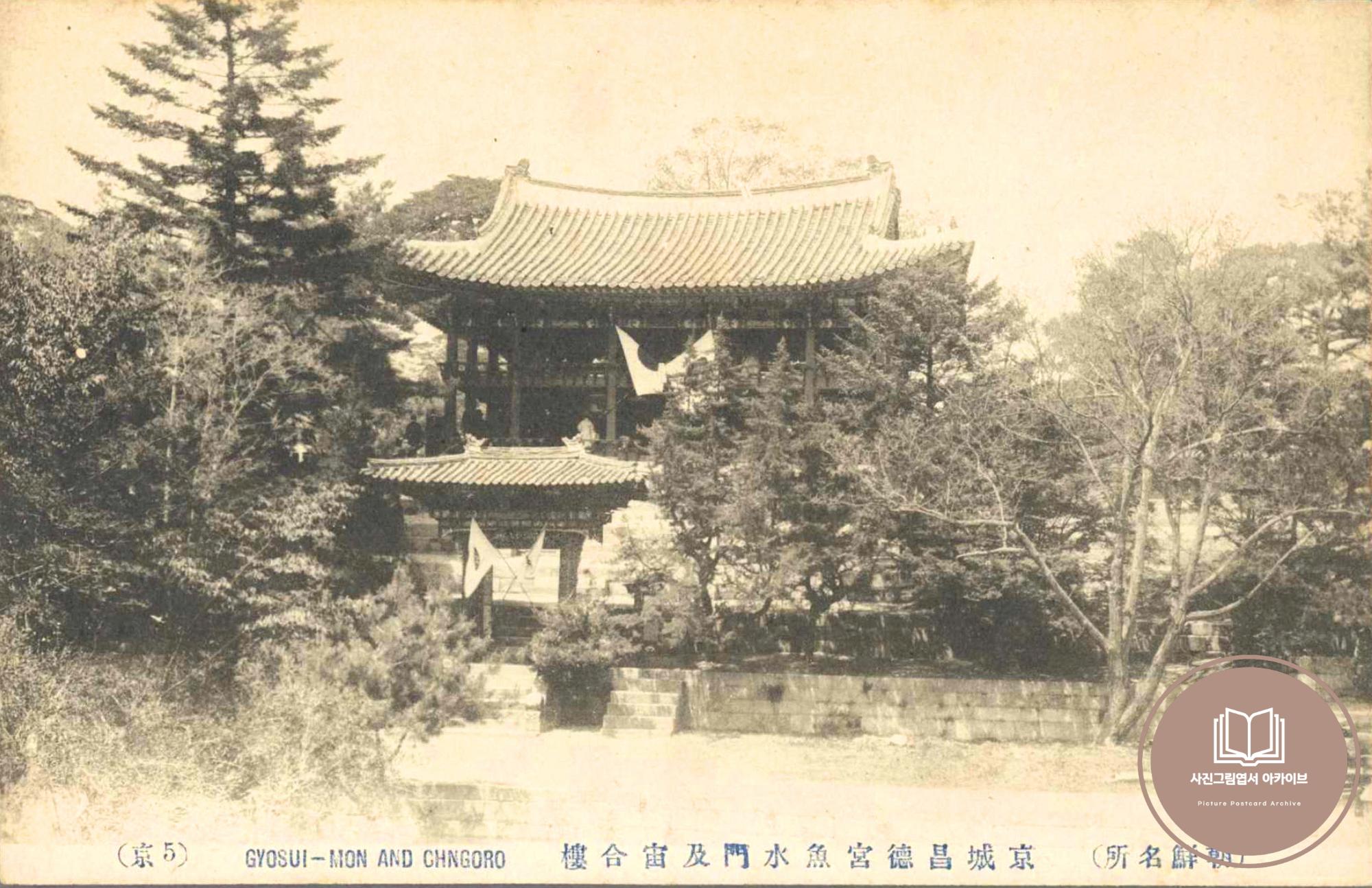 1910년대 일출상행(히노데)에서 발행한 조선명소 사진그림엽서 시리즈 중 창덕궁 주합루 일원의 모습이 담긴 자료이다. 본 엽서는 조선명소 시리즈 중 '京 5'에 해당하는 기록이며, 주합루와 입구인 어수문에 일장기가 개양된 모습을 볼 수 있다.
