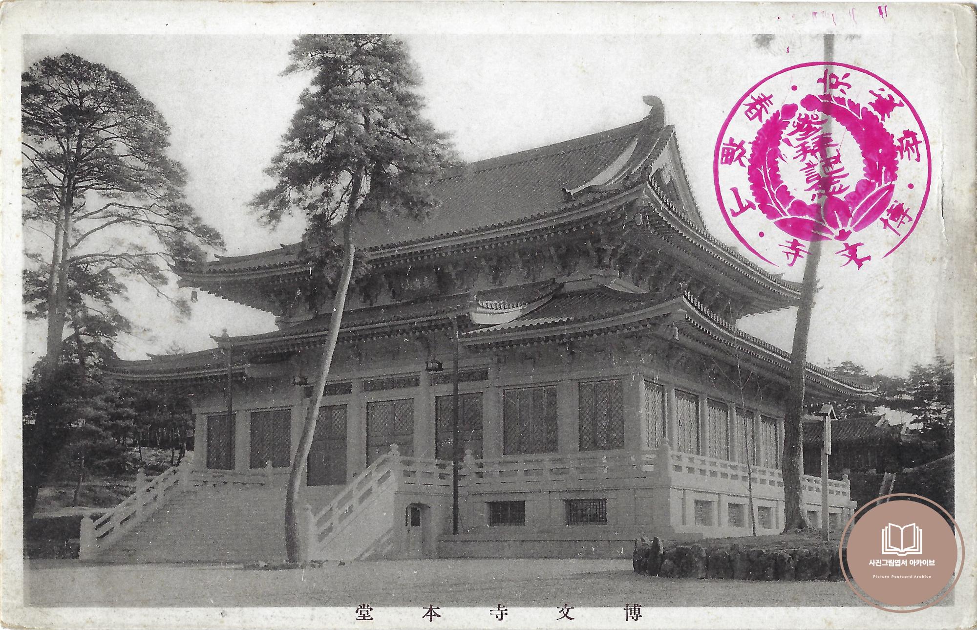 1930년대 중후반 박문사에서 발행한 박문사 본당이 촬영된 사진그림엽서이다. 좌측 상단에는 '춘무산(春畝山) 박문사(博文寺)'라 적혀있는 도장이 날인된 것이 특징이다. 일제는 오늘날의 장충단 공원 영역을 이등박문의 호를 인용하여 춘무산이라 칭했다.