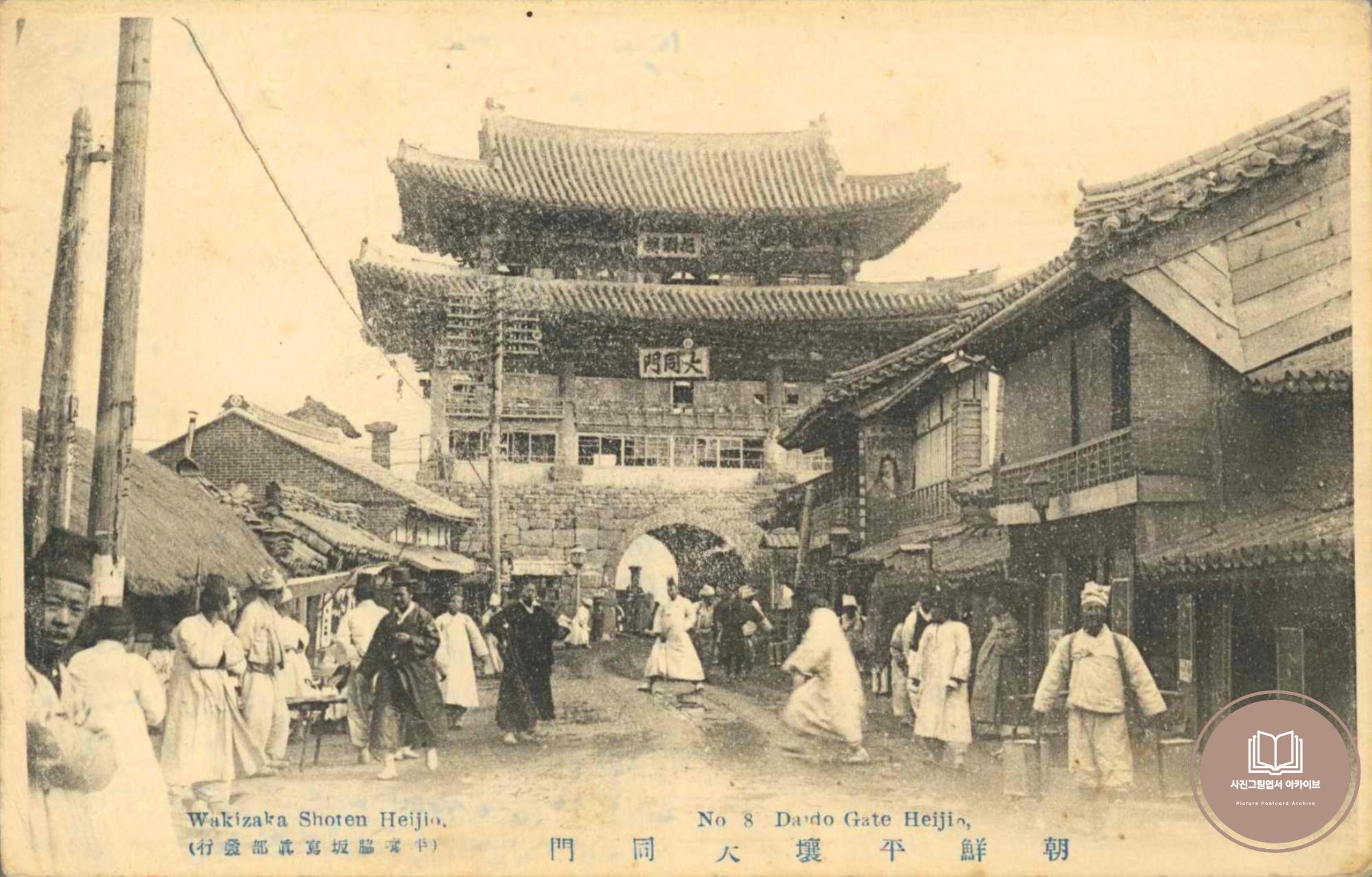 1918년 평양협판사진부(平壌脇坂寫眞部)에서 발행한 평양 대동문 성문 안 풍경이 수록된 사진그림엽서이다. 평양성의 동쪽 성문인 대동문은 대동강 나루터와 직결되는 곳으로 수많은 인파와 물산이 집합하는 평양 명소이자 집합지 중 하나이다.