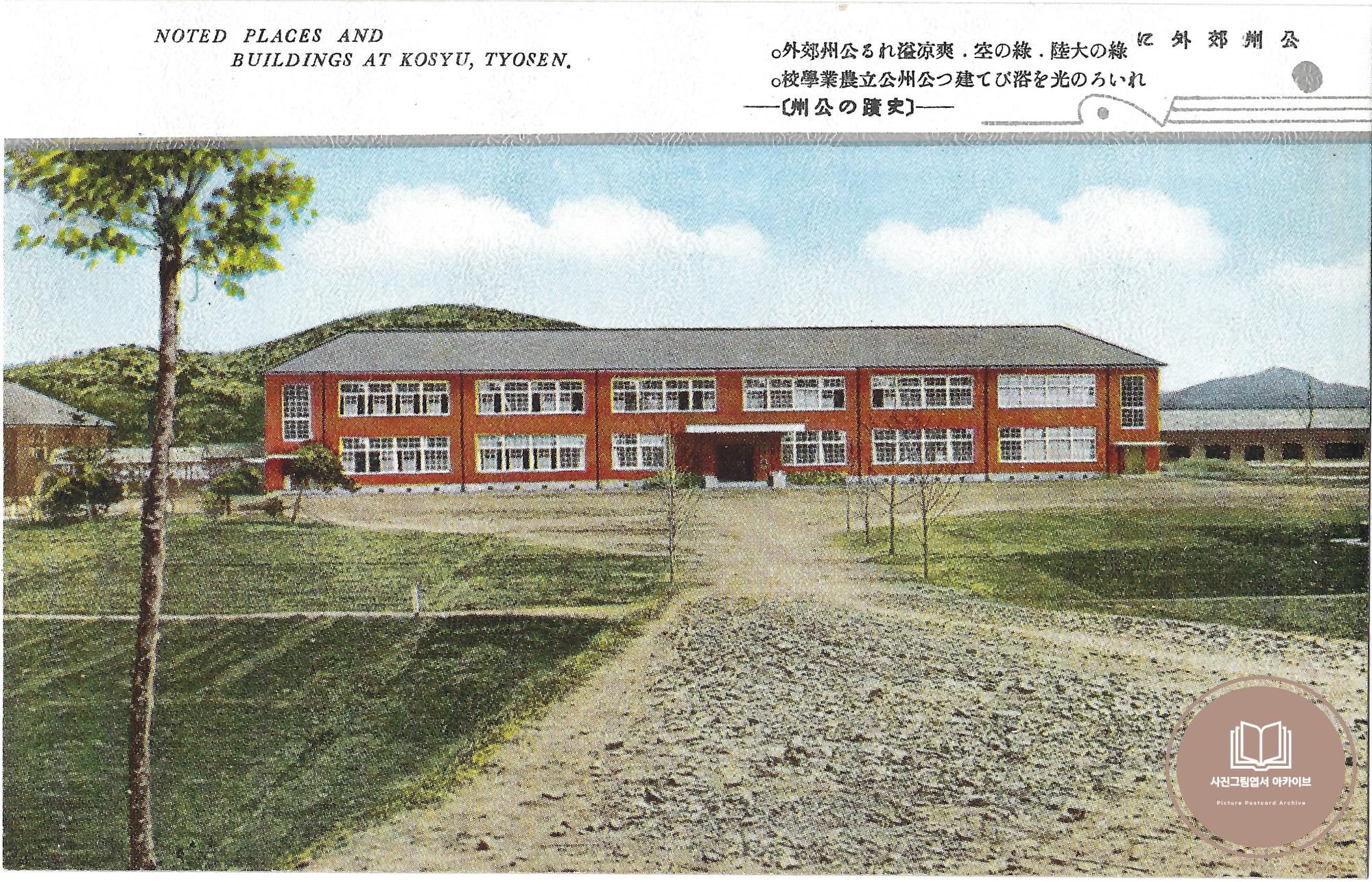 1930년대 말 일출상행(日之出常行)에서 발행한 '충청남도의 중심도시, 사적의 공주' 사진그림엽서 시리즈 중 공주공립농업학교 전경이 수록된 자료이다. 1933년 충청남도 도청 건물 중 일부를 활용하여 개교한 공주공립농업학교는 학생들의 증가와 농업 실습을 위해 1938년 장기면 신관리 196번지 일원으로 이전한다. 본 자료는 흔히 전막으로 이전 개교한 공주공립농업학교 본동의 모습을 담고있다.