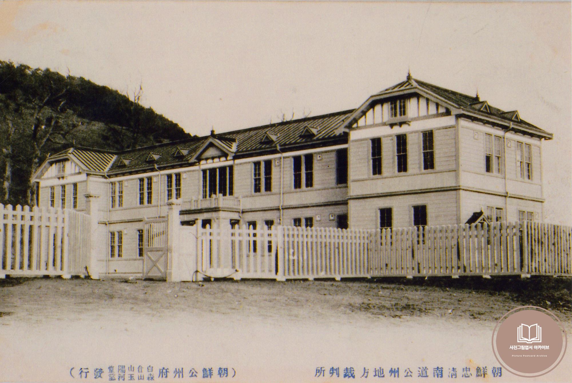 1910년대 초반 조선공주부백창산양당(朝鮮公州府白倉山陽堂)에서 발행한 공주지방법원 재판소 전경이 수록된 사진그림엽서이다. 공주지방법원 재판소는 1910년 05월 충남도청 북측의 봉황산 자락 아래에 본 사진그림엽서 속 모습과 같은 형태로 신축 개원했다. 1970년대 현대식 건축물로 재건축되기 이전까지 공주의 유명한 서양식 건축물이었으며, 벚꽃이 피는 계절에는 재판소 주변에 식재한 벚나무로 인해 벚꽃이 만개한 법원 풍경을 보여주었다.
