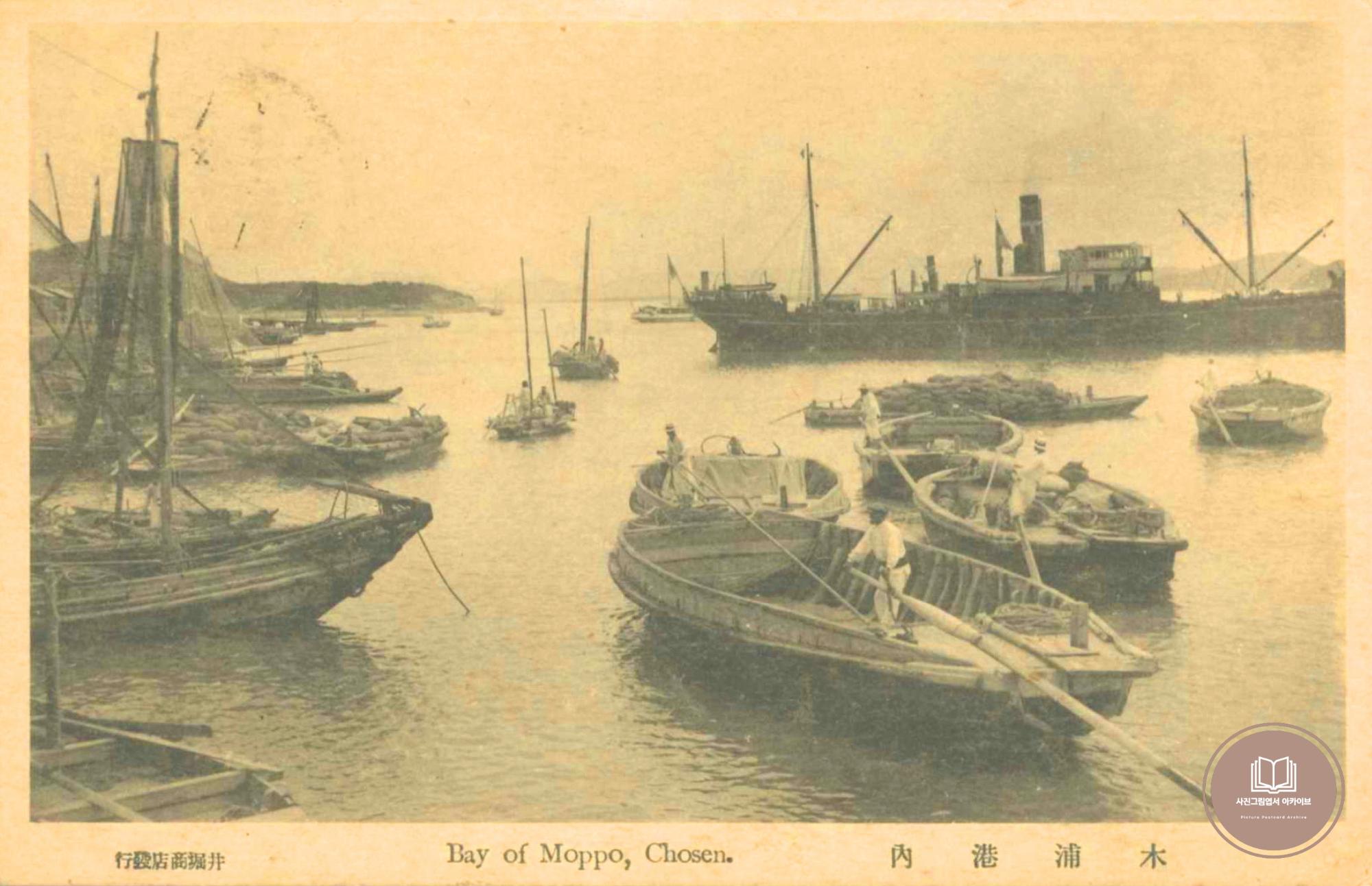 1924년 정굴상점(井堀商店)에서 발행한 목포항만 내 풍경을 수록한 사진그림엽서이다. 목포항을 일제에 의해 개발되어 호남일대의 곡창지대에서 산출되는 다량의 쌀을 공출하는 수탈 전진기지 중 하나로 활용되었다.