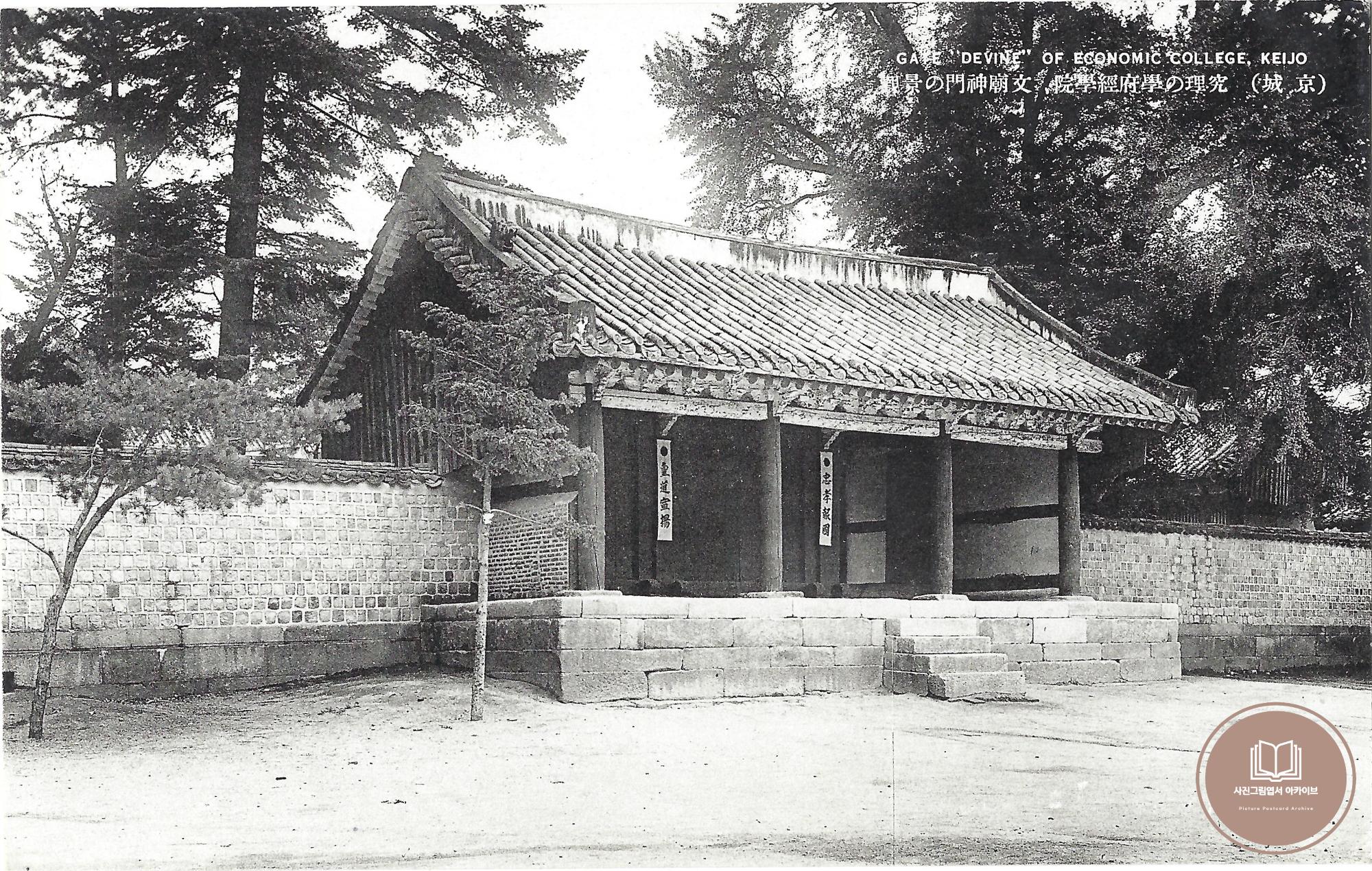 1940년 다이쇼사진공예소(大正寫眞工藝所)에서 발행한 '대경성의 신풍경' 16매 사진그림엽서 세트 구성 중 성균관(문묘) 신문(神門)의 모습이다. 경학원으로도 일컬어지는 성균관은 조선의 지식인 계층을 양성하는 곳이었으나, 일제에 의해 구체제의 시설 중 하나로 전락했다.