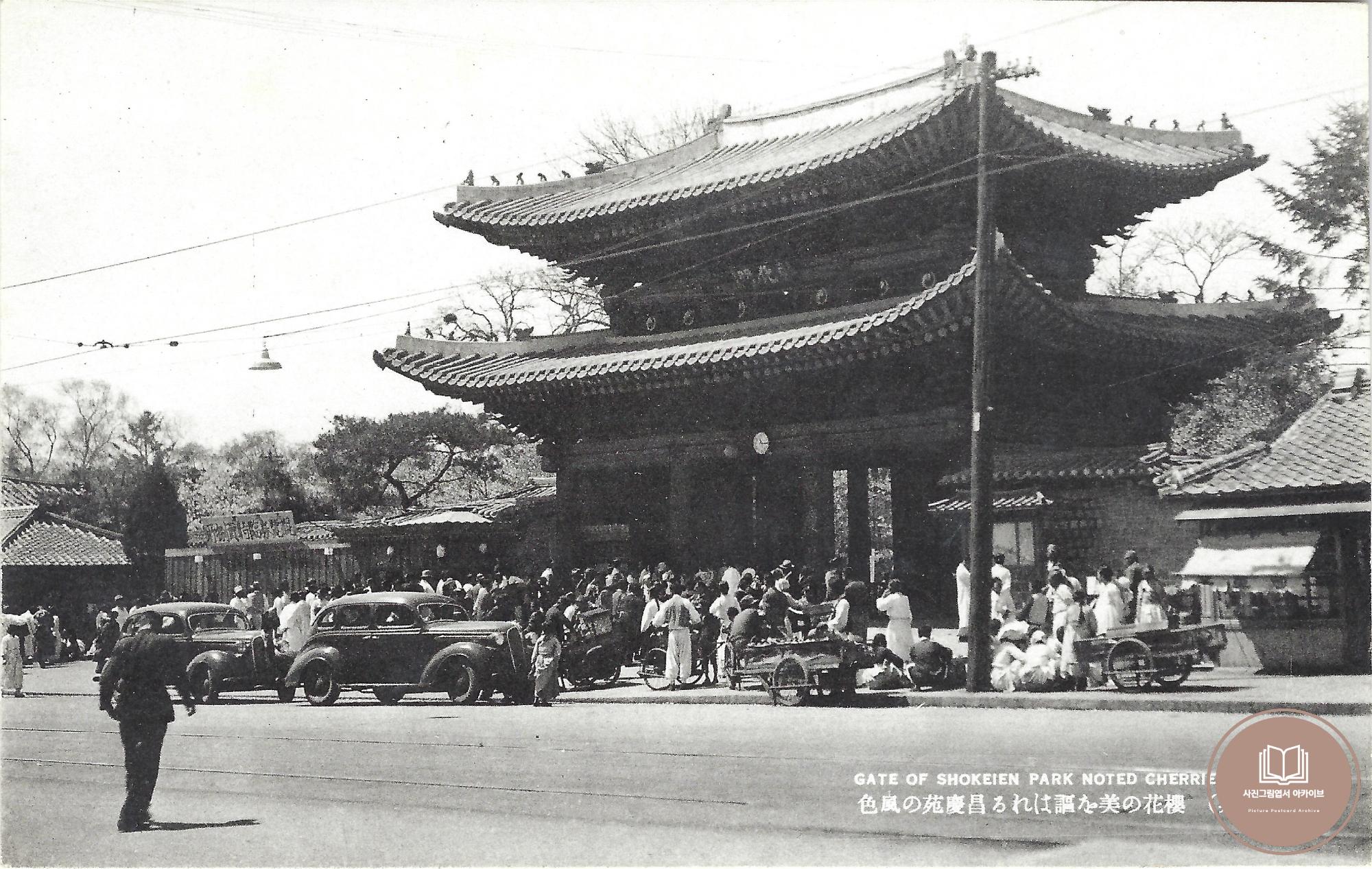 1940년 다이쇼사진공예소(大正寫眞工藝所)에서 발행한 '대경성의 신풍경' 16매 사진그림엽서 세트 중 창경궁 홍화문 전경 모습을 담은 기록이다. 일제는 경술국치 이후 창경궁에 대한 대규모 훼철작업에 착수한다. 식물원과 동물원을 궁궐 내 시설을 철거한 후 설치하여 창경궁 일대를 창경원으로 격하시켰다. 그 결과 본 사진그림엽서 속 모습처럼 수많은 인파가 벚꽃놀이에 참여하기 위해 방문하는 위락시설로 전락한다. 매표소 앞 수많은 인파와 방문객을 대상으로 먹거리 등을 판매하는 노점상이 뒤엉킨 모습을 볼 수 있다. 홍화문 뒤로 벚꽃이 만개한 것으로 보아 1940년 무렵 봄날의 상춘객 모습으로 추정된다.