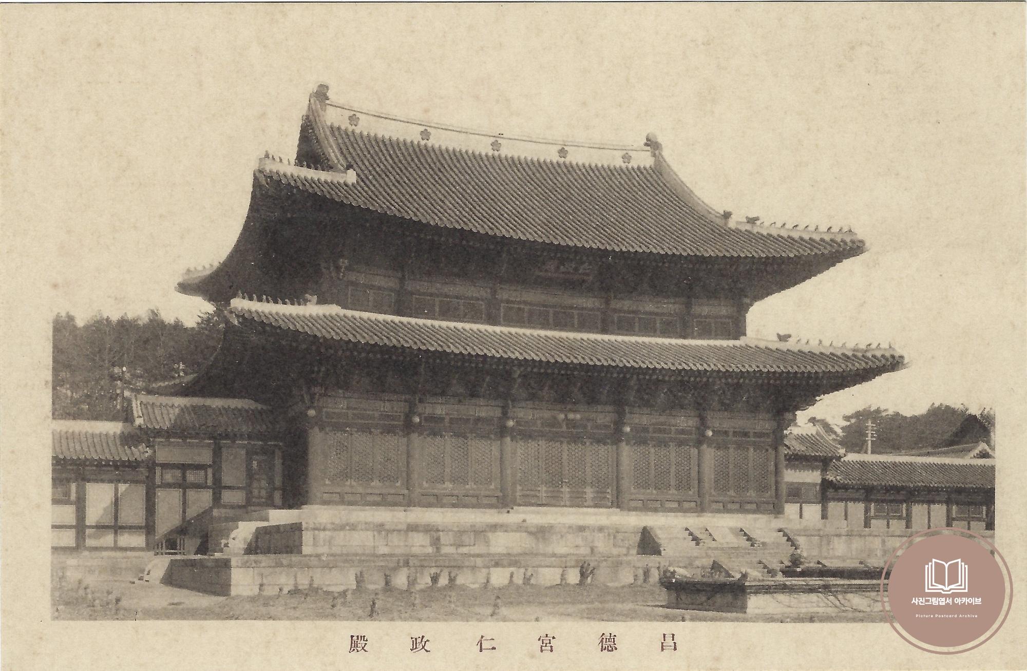 조선총독부 직속 기관인 이왕직(李王職)에서 1920년대 발행한 이왕직장판 창덕궁 비원 회엽서(李王職藏版昌德宮秘苑繪葉書) 其一의 구성인 창덕궁 인정전 자료이다. 인정전은 창덕궁의 정전으로 근대 개항기 실내에 전등이 가설되는 등의 외부 양식이 이식된 건축물이다. 용마루에는 조선과 대한제국 황실을 상징하는 오얏문이 각인된 것이 특징이다.