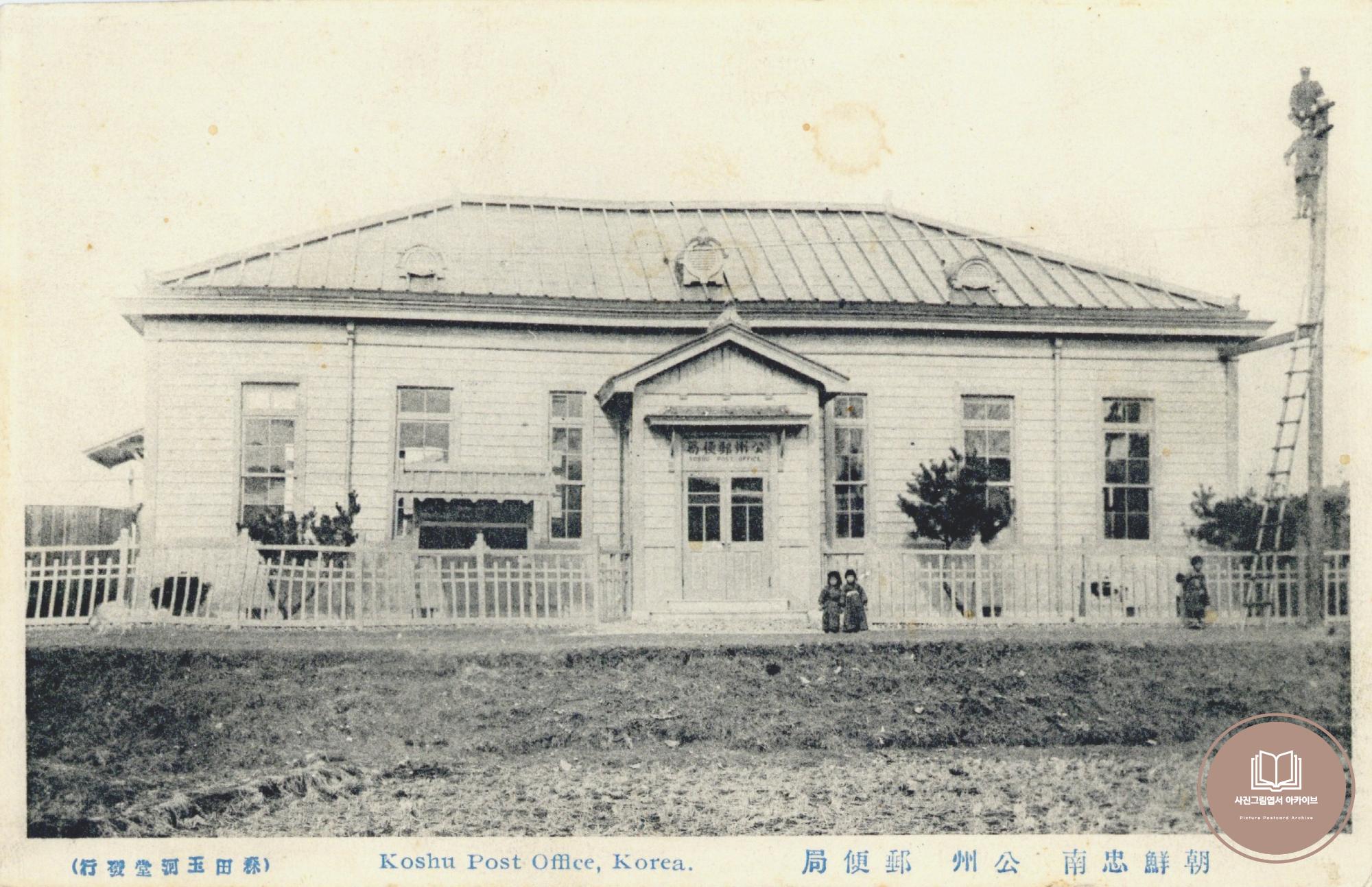 1913년 12월 공주우편국의 반죽동 이전을 기념하여 발행된 사진그림엽서이다. 오늘날 공주시 반죽동의 공주우체국 부지의 원 건물의 모습이다. 우편국 정문 앞의 신작로와 추수를 끝마친 논바닥 모습을 확인할 수 있다.