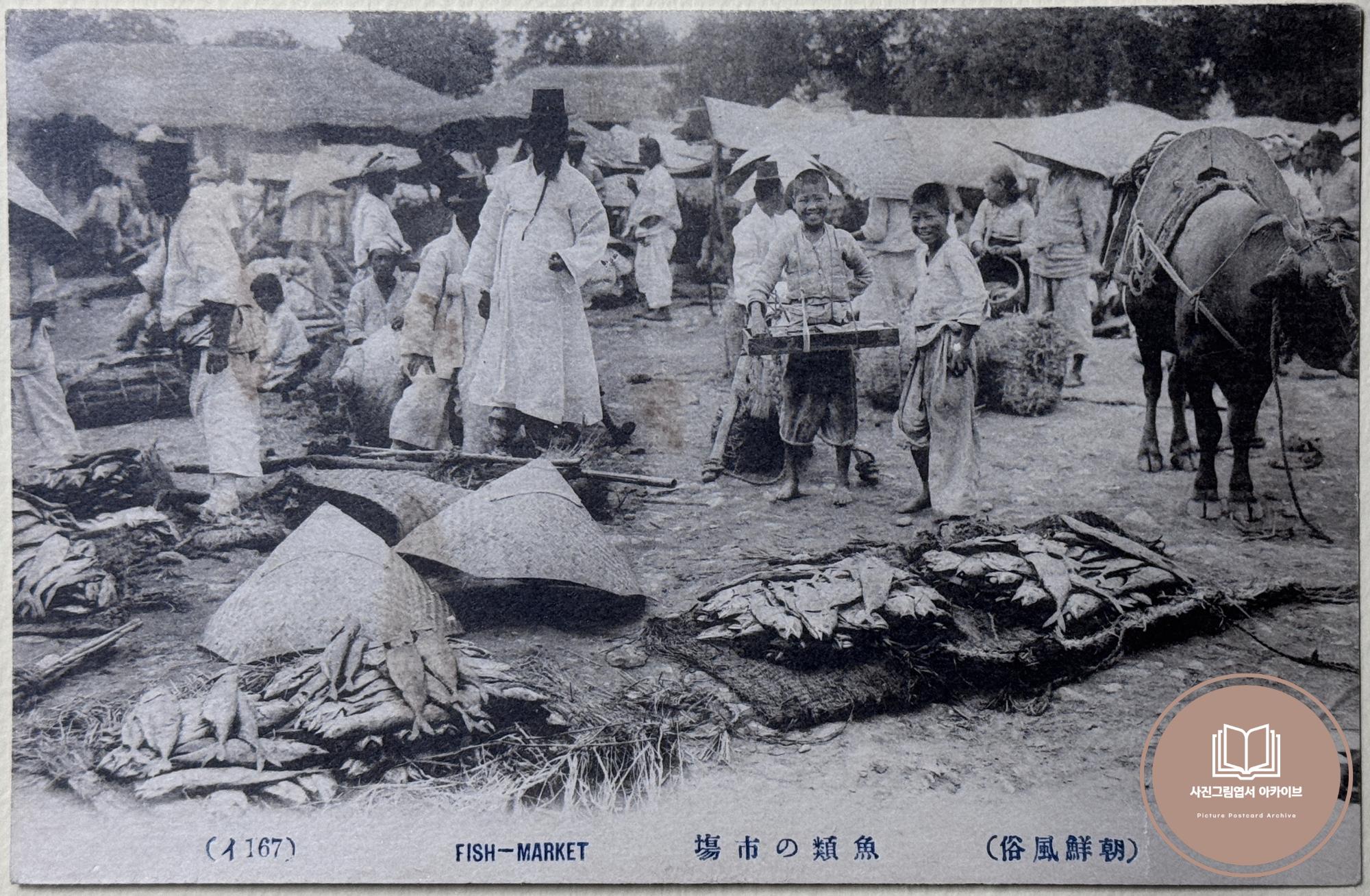 1910년대 초반 발행된 것으로 추정되는 조선풍속 사진그림엽서 시리즈 중 어시장 풍경을 담은 자료이다. 초가집 형태의 민가 모습을 확인할 수 있고, 판매 중인 생선의 모습을 볼 수 있다.