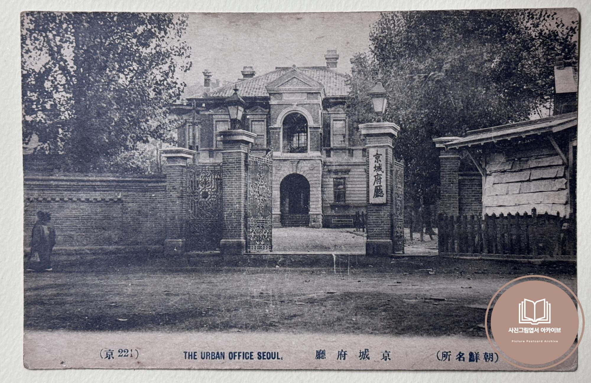 1910년대 일출상행(日之出商行)에서 발행한 조선명소 시리즈 사진그림엽서 중 경성부 청사 모습이 수록된 자료이다. 본 사진그림엽서는 '京 221'에 해당하는 자료이며, 1926년 오늘날 서울도서관 역할을 수행하는 경성부청 신청사 준공 이전까시 사용하던 舊 경성부청 청사의 모습이다.