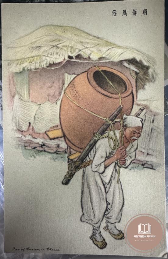1943년 일본 와카야마에 소재한 다이쇼 하토 브랜드(Taisho Hato Brand)에서 발행한 조선풍속 초화팔편(朝鮮風俗抄畵八片) 8매 세트 중 독을 짊어진 노인 엽서이다. 자료 후면에 소화 18년 인장이 날인된 것을 통해 1943년 발행된 엽서이다.