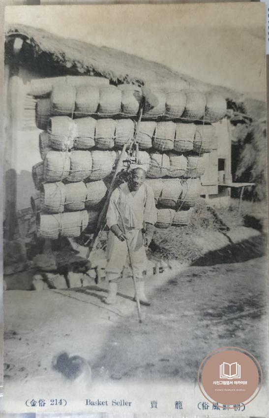 1910년대 일출상행(日之出商行)에서 발행한 조선풍속 사진그림엽서 시리즈 중 바구니 판매상 모습이 담긴 자료이다. '金俗 214'라는 표기를 확인할 수 있으며, 등에 짊어진 지게에 자신의 키보다 높고 넓은 대나무 바구니를 짊어진 상인 모습이 인상적이다.