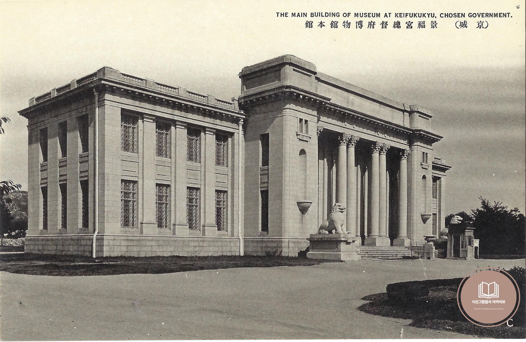 1930년대 다이쇼사진공예소(大正寫眞工藝所)에서 발행한 것으로 추정되는 '정치경제백선의 중심 - 경성부 명승집' 사진그림엽서 13장 중 경복궁 경내에 위치한 조선총독부 박물관 본관 모습이 담긴 자료이다. 조선총독부 박물관은 조선의 법궁인 경복궁을 철저히 유린한 후 설치된 식민통치기구 중 하나로 일제가 편찬한 식민사관을 대내외적으로 선전하기 위해 건립한 박물관이다. 1915년 조선총독부 청사보다 먼저 설치되었고, 조선 내 주요 고고학 유물과 고미술품을 전시하는 공간이자 식민사관 연구의 중추역할을 수행했다. 본래 1915년 조선총독부의 식민통치 선전을 위한 조선물산공진회의 전시장으로 활용되었던 본관 건물은 공진회 종료 후 그대로 박물관으로 개관하여 운영되었다.