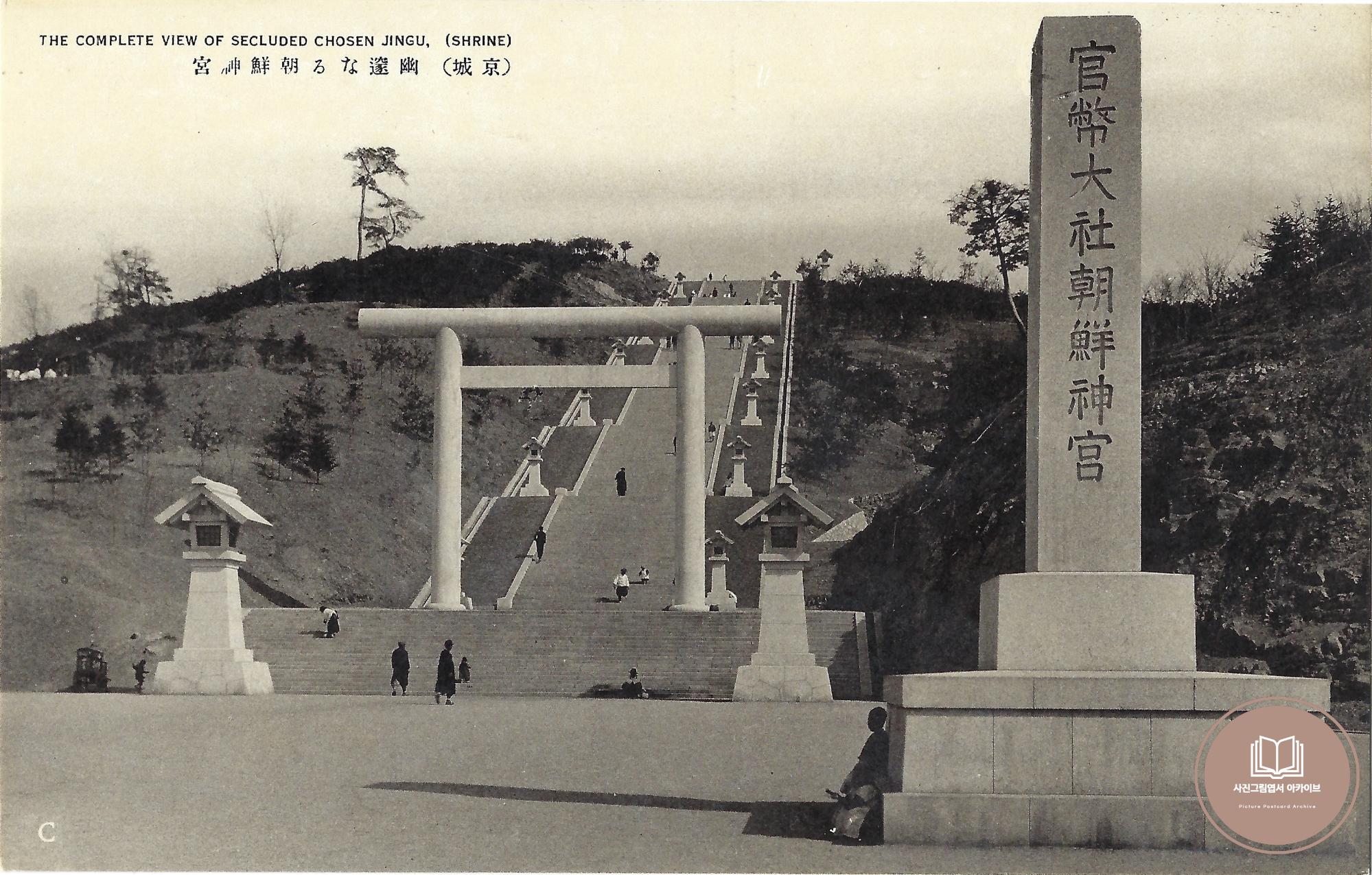 1930년대 다이쇼사진공예소(大正寫眞工藝所)에서 발행한 것으로 추정되는 '정치경제백선의 중심 - 경성부 명승집' 사진그림엽서 13장 중 조선신궁의 사호표와 토리이, 대석단 모습이 담긴 자료이다. 조선신궁은 일제 식민통치 수단 중 하나로 1912년 조선신사로 설립되었다. 현재의 서울 남산 한양공원에 위치한 조선신궁은 일본 건국신화의 주역인 아마테라스와 경술국치의 주역 명치일왕을 제신(祭神)으로 두고있다. 1925년 일제는 조선신사에 대한 사격을 높이기 위해 본래의 조선신사 명칭을 조선신궁으로 개칭하고 관폐대사로 격상하는 등 일본 식민통치의 정신적 중심지 역할을 가속화했다.