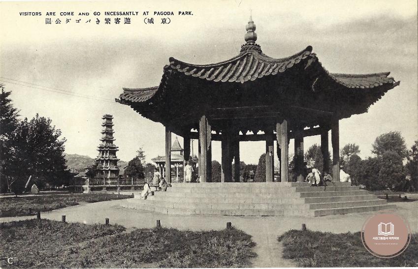 1930년대 다이쇼사진공예소(大正寫眞工藝所)에서 발행한 것으로 추정되는 '정치경제백선의 중심 - 경성부 명승집' 사진그림엽서 13매 중 파고다공원 모습이 담긴 자료이다. 파고다공원은 탑골공원으로도 불리는데, 공원 중앙의 원각사지 십층석탑이 위치해있기 때문이다. 본래 파고다공원 부지에는 조선 세조가 창건한 원각사가 있었고, 그때 십층석탑도 함께 건립되었다. 그러나 연산군과 중종 재임기간을 거치며 사찰이 훼철되고 주변에 민가가 건립되는 등 철저히 훼손되었다. 개항 이후 1897년 고종의 한성개조사업 일환으로 대한제국 최초의 근대공원 부지로 조성할 계획이 설립되었고, 그 결과 오늘날까지 이어지는 파고다공원이 조성되기에 이른다.