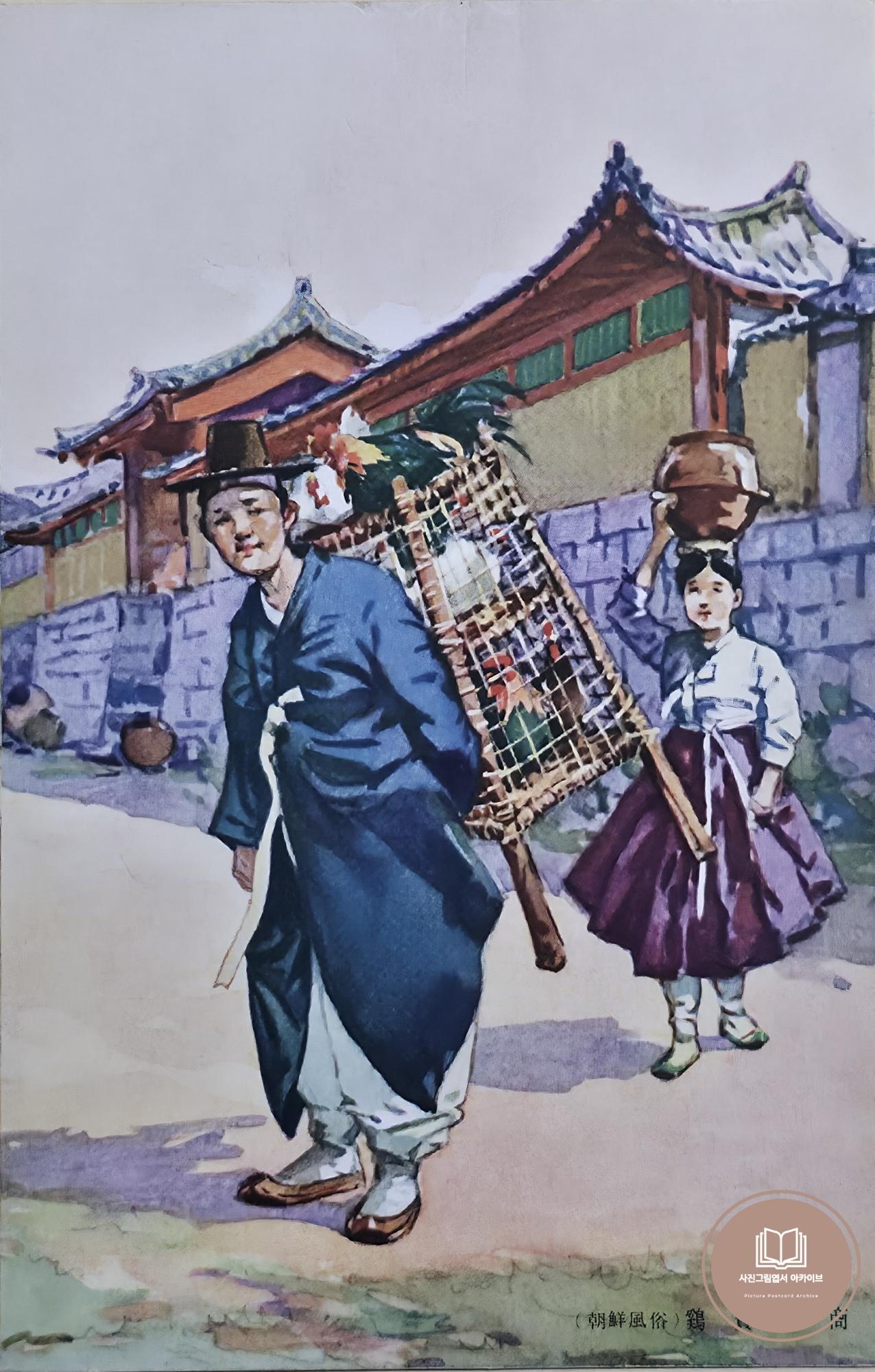 1930년대 일출상행(日之出商行)에서 발행한 것으로 추정되는 '조선 풍속집 대표적 수채 스케치(朝鮮風俗集 代表的 水彩スケッチ)' 사진그림엽서 8매 중 닭파는 행상인 모습이 담긴 자료이다. 닭장을 짊어진 장사꾼의 모습과 함께 물동이를 머리에 짊어진 아낙 모습을 확인할 수 있다.