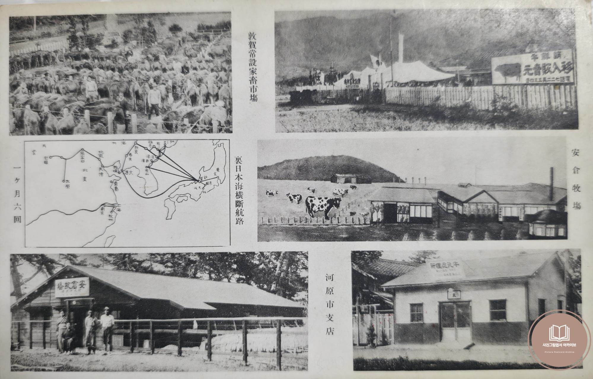 1920년대 조선총독부에서 조선우의 품종 개량과 일본 본토로의 조선우 공출 등을 기념하기 위해 발행한 축산공예박람회 조선우 홍보 관련 사진그림엽서이다. 지금의 원산과 청진 중심으로 일본 본토와의 적극적인 연결을 도모하여 조선우의 일본 내 진출을 모색하였고, 전문적인 목장에서 조선우를 개량했음을 본 자료를 통해 유추할 수 있다. 나아가 일본 후쿠이현의 쓰루가(敦賀) 지역에 열린 상설가축시장 모습 등을 확인할 수 있다.