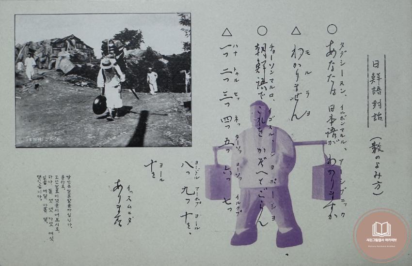 1910년대 일출상행(日之出商行)에서 발행한 회활자재 조선의 말(會活自在朝鮮のことば) 사진그림엽서 8매 세트 중 조선말로 숫자를 세는 방법에 대해 적어둔 자료이다. 조선인 지게꾼이 옹기 등을 짊어진 모습을 확인할 수 있고, 일본어로 한국어 셈하는 방법이 적혀있다.