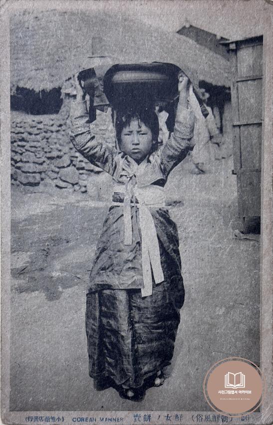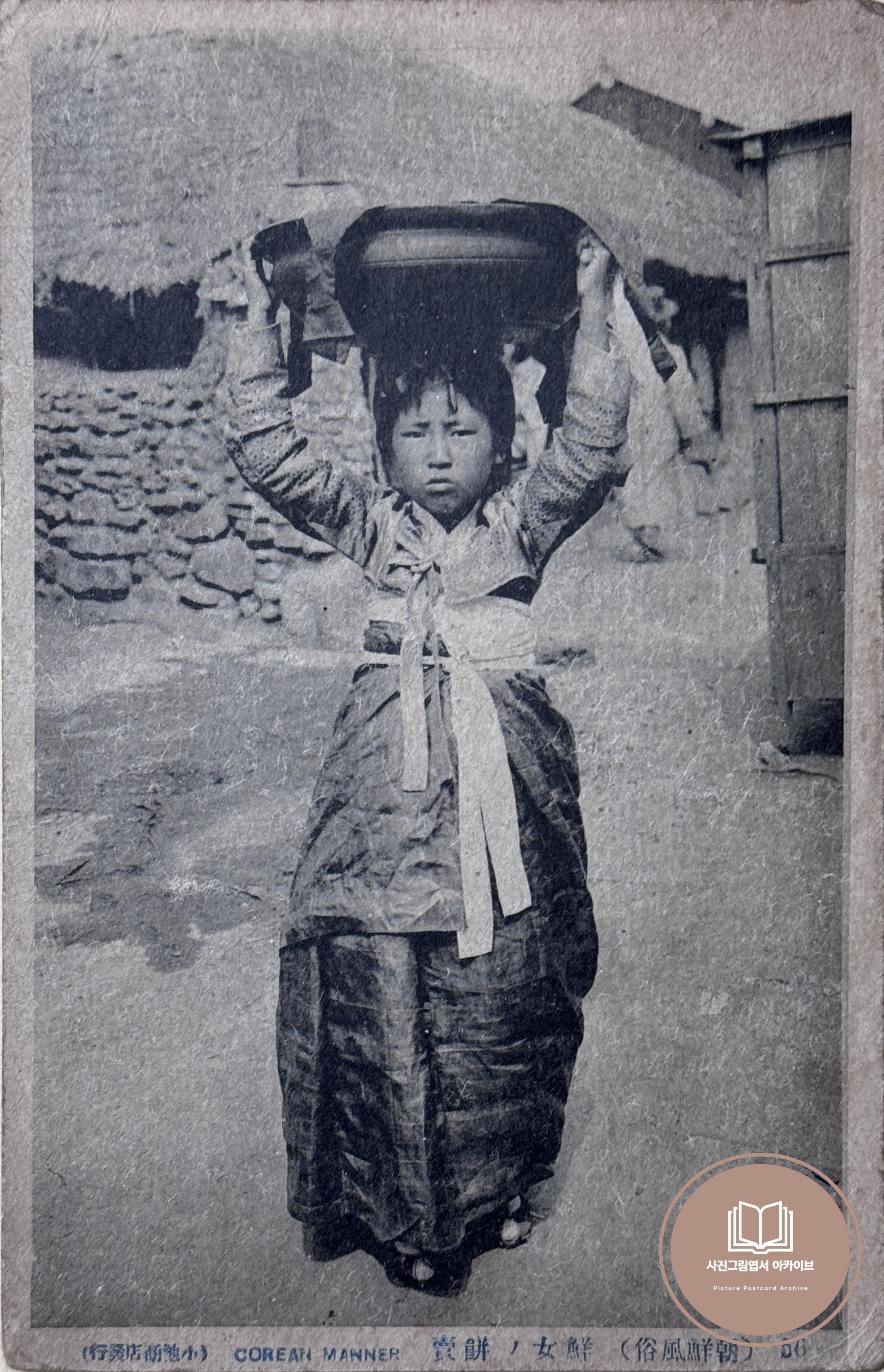 1910년대 소지상점(小池商店)에서 발행한 것으로 추정되는 조선풍속 사진그림엽서 중 떡장수 여인 모습이 담긴 자료이다. 어린 모습의 소녀가 무거운 옹기 형태의 소쿠리를 머리에 짊어진 모습을 확인할 수 있다.