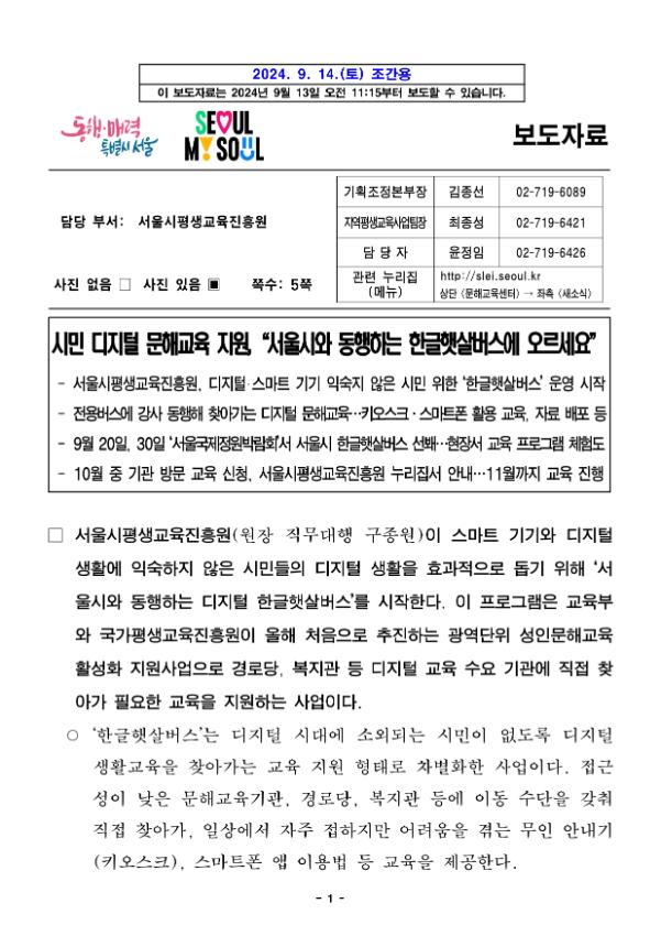 서울특별시평생교육진흥원이 스마트 기기와 디지털 생활에 익숙치 않은 시민을 위한 '디지털 한글 햇살버스' 제도를 실시하며 배포한 보도자료이다.