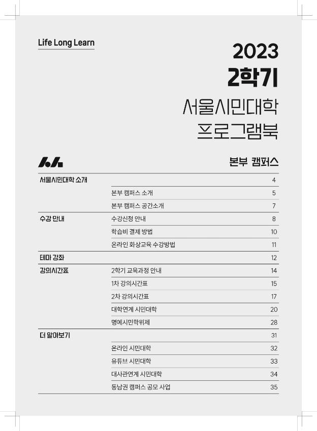 2023년 2학기 서울시민대학 본부 캠퍼스의 개설강좌와 각종 안내 사항 등을 수록한 프로그램북이다.