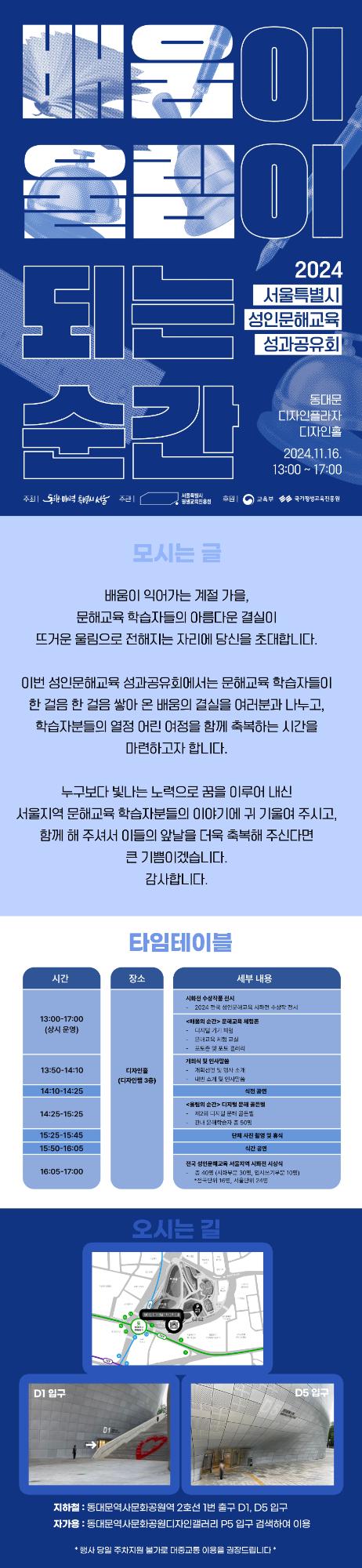 2024년 서울특별시 평생교육 성인문해교육 성과공유회 개최를 알리는 초대장이다.