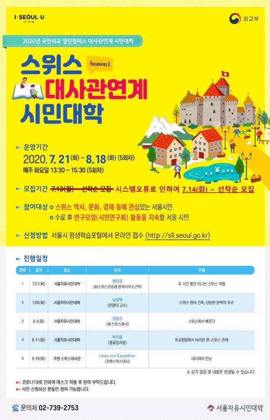 2020년 국민외교 열린캠퍼스 대사관연계 시민대학 특강 과정 중 스위스 대사관 연계 시민대학 개강을 알리는 홍보 포스터이다.