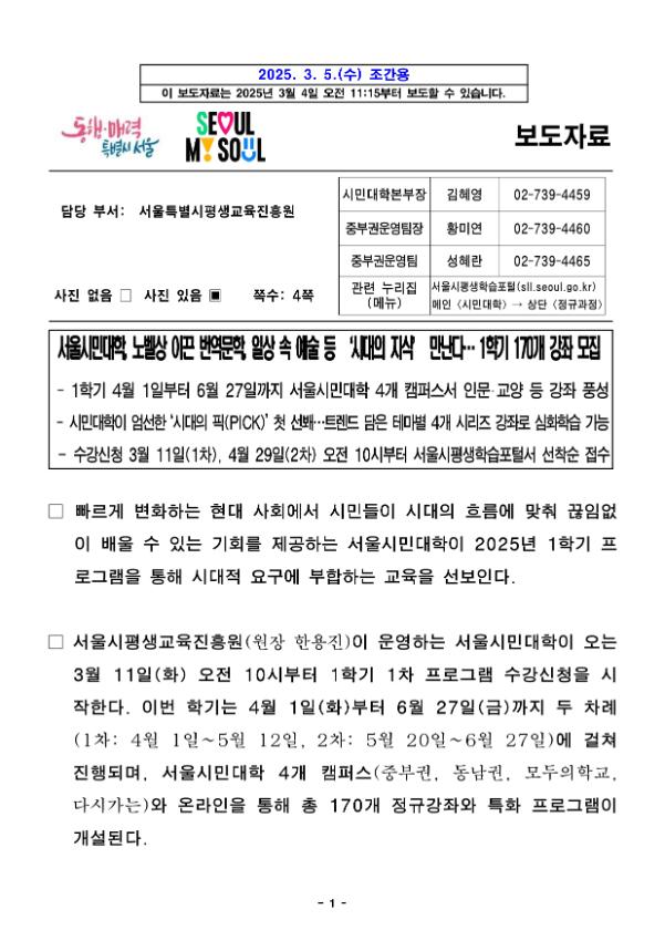 빠르게 변화하는 현대 사회에서 시민들이 시대의 흐름에 맞춰 끊임없이 배울 수 있는 기회를 제공하는 서울시민대학이 2025년 1학기 프로그램을 통해 시대적 요구에 부합하는 교육을 선보인다.