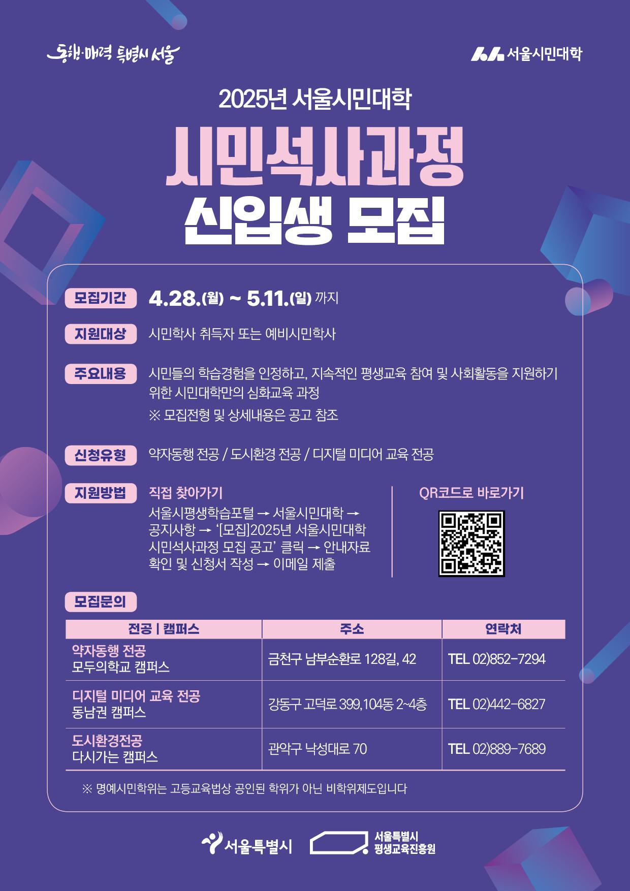 2025 서울시민대학 명예시민학위제 시민석사과정 모집 안내 홍보포스이다.