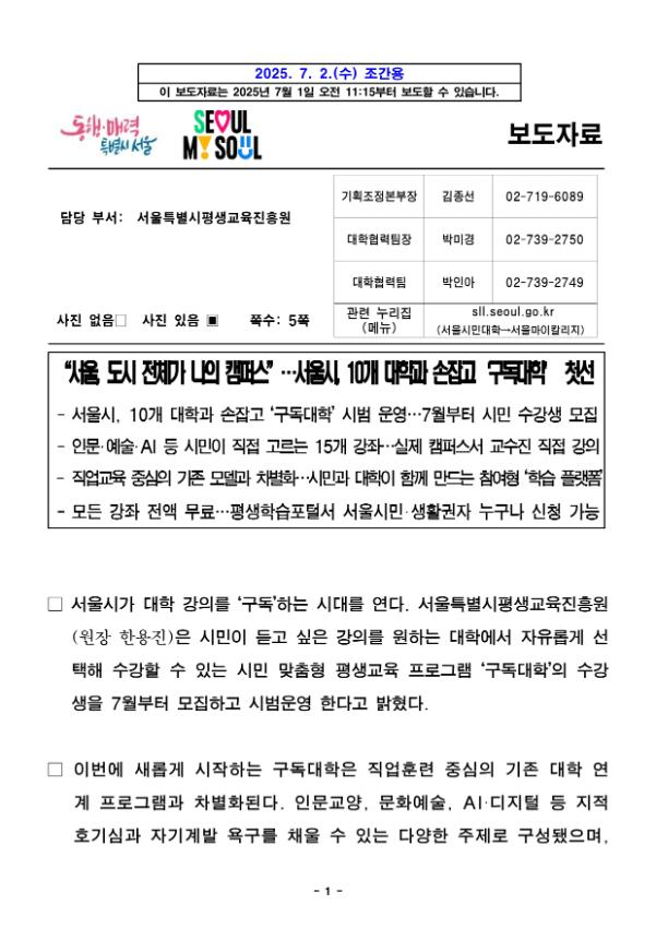 시민이 듣고 싶은 강의를 원하는 대학에서 자유롭게 선택해 수강할 수 있는 시민 맞춤형 평생교육 프로그램 ‘구독대학’의 수강생을 7월부터 모집하고 시범운영 한다. 구독대학은 신문·잡지·OTT처럼 원하는 수업을 선택해 듣는 구독형 학습 모델로, 서울이라는 도시 전체가 캠퍼스가 되는 시대를 열어간다.