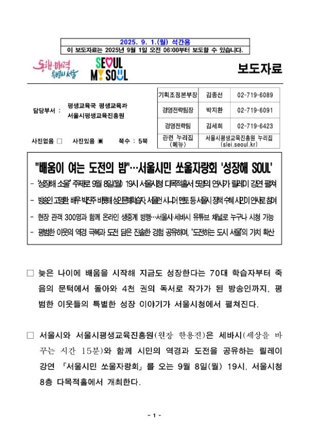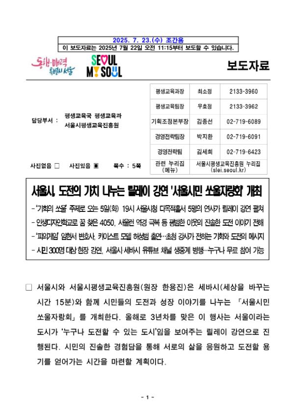 서울시 도전의 가치 나누는 릴레이 강연 서울시민 쏘울자랑회 개최