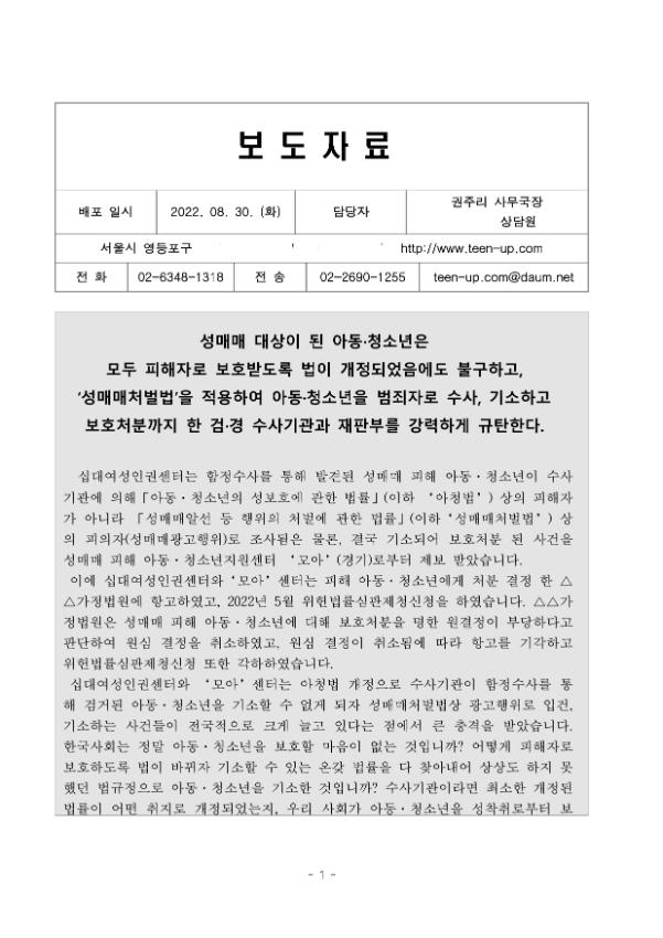 2021년~2022년을 십대여성인권센터의 전환시기로 보았다. 텔레그램 n번방 성착취사건으로 한국 사회 전체가 공분으로 들끓던 2020년, 제20대 국회 해산 전 ‘아청법’ 개정안 국회통과를 목표로 십대여성인권센터가 공동대표단체와 사무국을 맡은 ‘아청법’ 개정 공대위는 토론회, 기자회견, 항의 집회, 언론 대응, 서명운동, 성명서 발표, 영상제작 등 다양한 방식으로 법개정 운동을 전개하였고, 그 결과 2020년 4월 ‘아청법’ 개정안은 국회 본 회의를 통과하였다. 드디어 ‘아청법’이 개정된 것이다. 8년여 간의 긴 법개정 운동을 통해 이뤄낸 성과이지만, 코로나19 팬데믹 상황이 장기화되고, 대통령 선거를 앞둔 한국사회가 정치적 혼란에 휩싸이면서 개정된 법률에 대한 대국민적 홍보는 없었고, 젠더갈등을 부추겨 혐오와 차별을 기반으로 권력을 유지하려는 세력들은 더욱 강화되면서 이뤄낸 법개정의 기쁨은 잠깐, 모든 상황에서 흐지부지되거나 오히려 후퇴하였다. 여전히 아동·청소년을 범죄 피의자로 수사하는 일이 벌어지고 있을 뿐 아니라, 함정수사로 아동·청소년을 붙잡고 성매매 처벌법의 광고혐의로 아동·청소년을 기소하는 등 생전 들어보지도 못한 다양한 방식들이 고안되어 과거 법처럼 아동·청소년을 범죄자 취급하는 일이 비일비재 발생했다. 법은 바뀌었지만, 지원체계는 부실하고, 법이 바뀌었으니만치 현실은 저절로 바뀌어 오히려 운동장이 기울어진 것처럼 말하며, 힘든 과정을 겪으며 겨우 이뤄낸 각종 피해자 지원 법률들에 관해 위헌결정이 내려졌다.