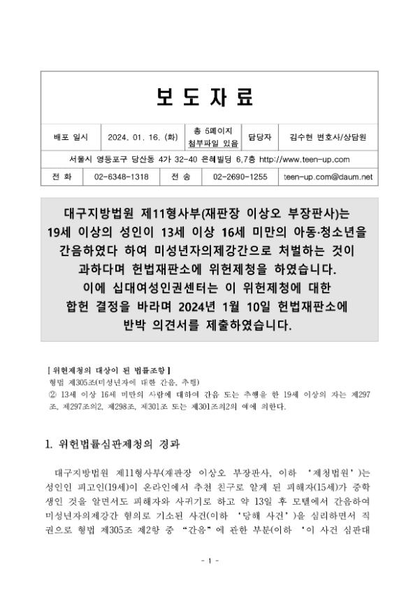 2024년 1월 16일 십대여성인권센터가 미성년자의제강간 위헌제청에 대한 반박 의견서를 제출하였다는 내용의 보도자료이다. 보도자료와 함께 반박 의견서를 첨부하였다.
