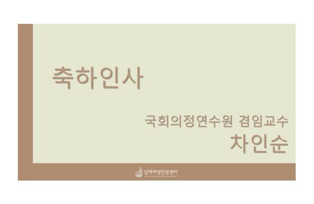 2023년 12월 5일(화요일) 포스코센터 4층 이벤트홀에서 진행된 십대여성인권센터 설립 10주년 기념 행사에서 차인순 국회의정연수원 겸임교수 축하인사 영상이다.