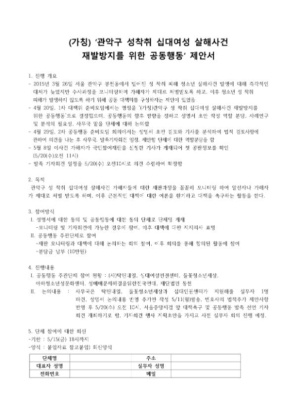 | 검색어 | 십대여성인권센터,2015,공동행동,관악구 성착취 십대여성 살해사건,관악구 성착취 십대여성 살해사건 재발방지를 위한 공동행동,공동행동 제안서 |