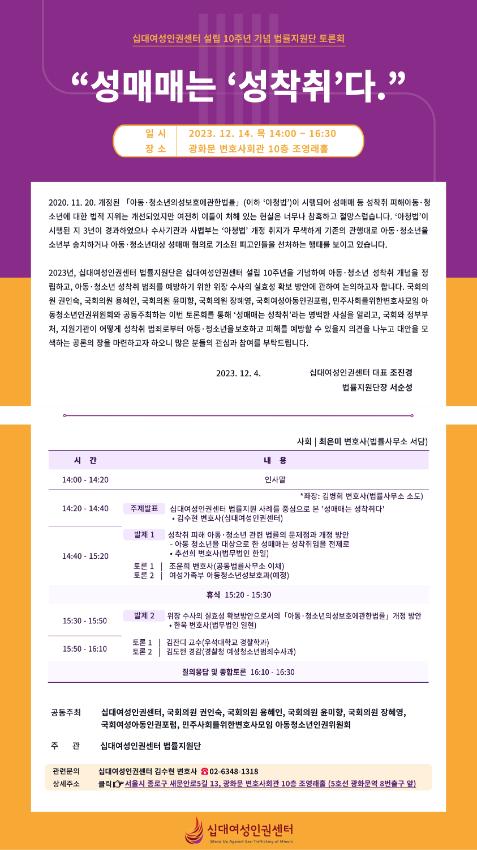 2023년 12월 14일(목) 광화문 변호사회관 10층 조영래홀에서 진행된 십대여성인권센터 설립 10주년 기념 법률지원단 토론회 "성매매는 '성착취'다." 웹전단이다.