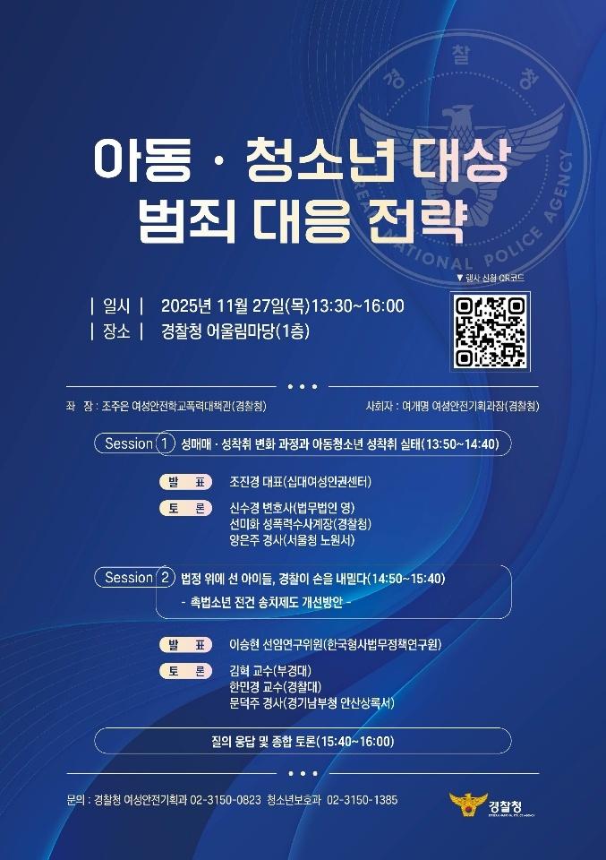 2025년 11월 27일(목) 13:30~16:00 경찰청 어울림마당(1층)에서 진행된 경찰청 세미나 '아동·청소년 대상 범죄 대응 전략' 웹전단이다.