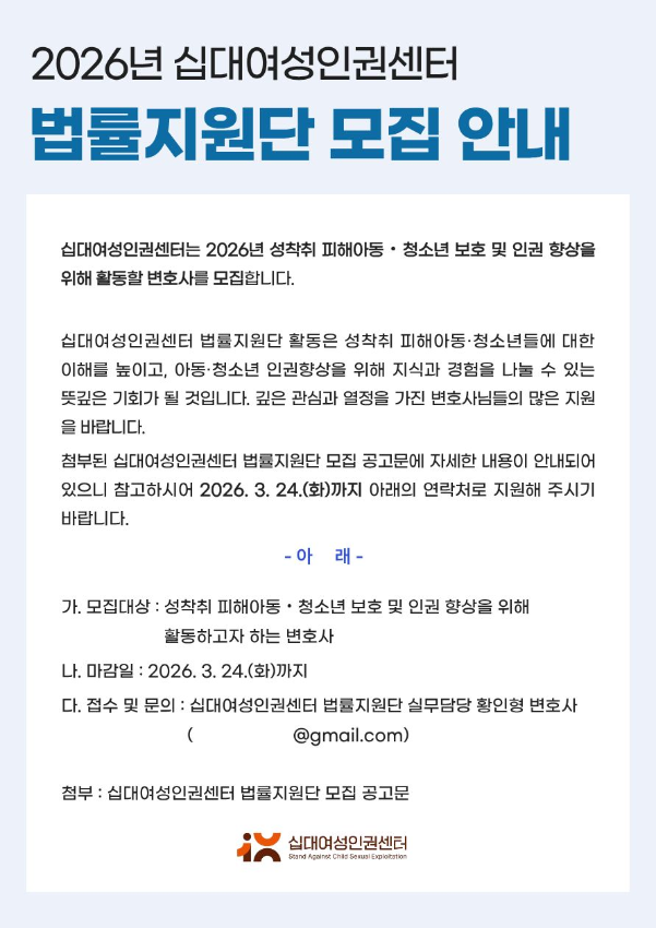 2026년 3월 11일 게시된 십대여성인권센터 법률지원단 모집 공고문이다.