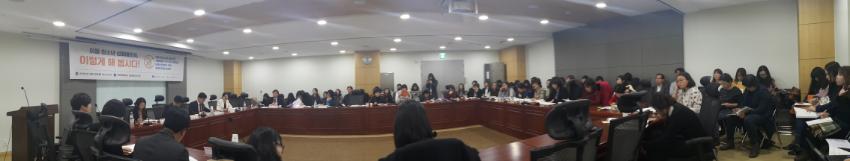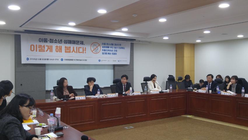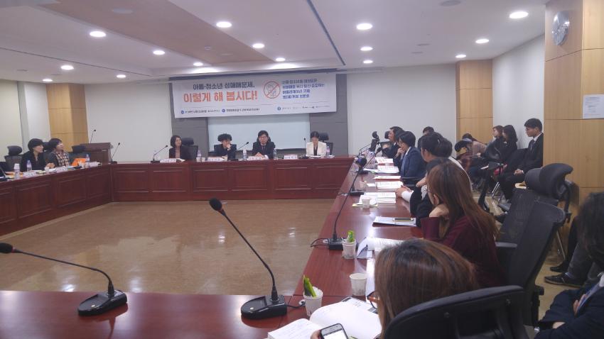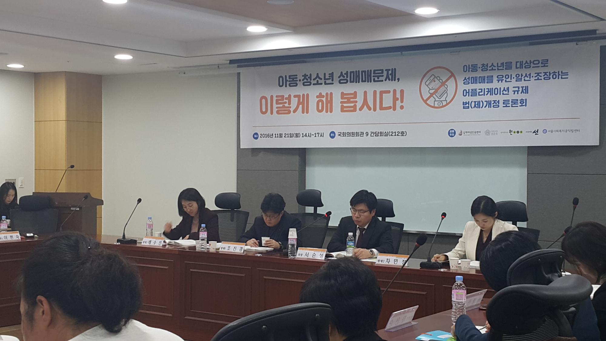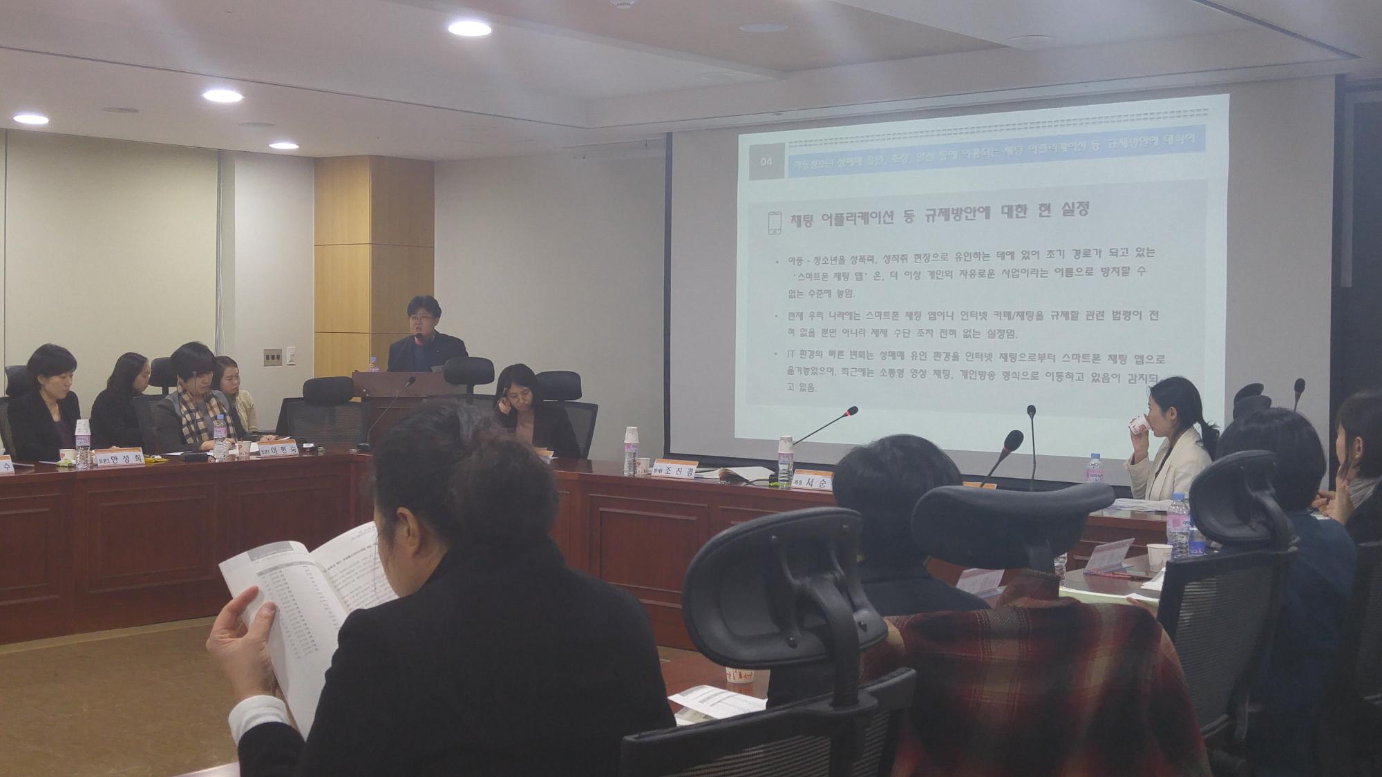아동청소년 성매매 문제, 이렇게 해 봅시다! 아동청소년을 대상으로 성매매를 유인알선조장하는 어플리케이션 규제 법(제)개정' 토론회 사진이다.