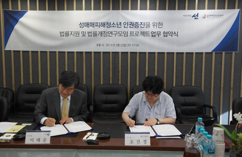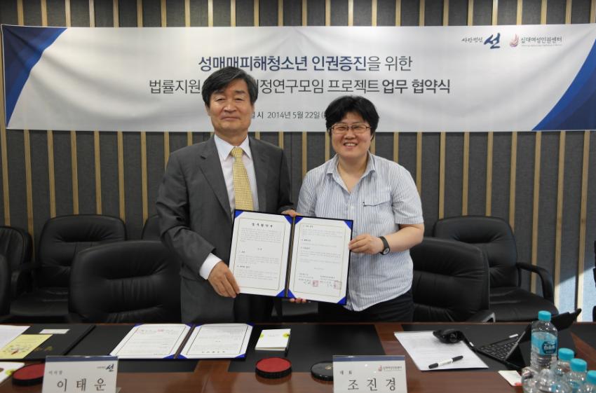 사진은 십대여성인권센터가 성매매피해청소년 인권증진을 위한 법률지원 및 법률개정연구모임 프로젝트 진행을 위해 사단법인 선과 협약을 체결하는 모습을 촬영하였다.