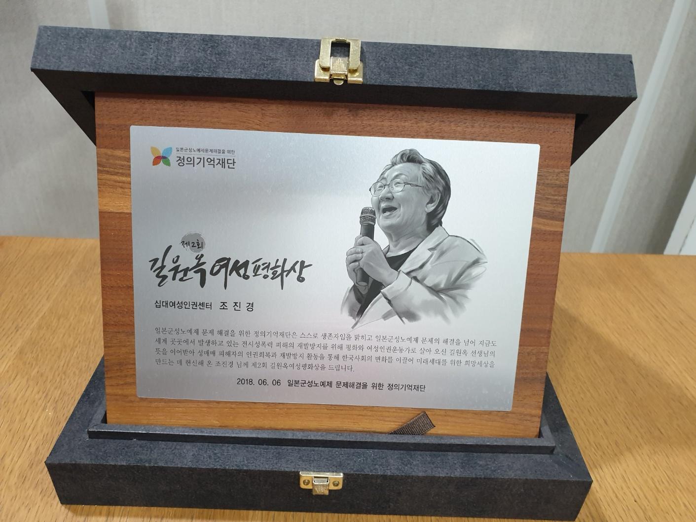 정의기억제단 제 2회 <길원옥 여성평화상> 조진경 대표 수상 상패 사진이다.