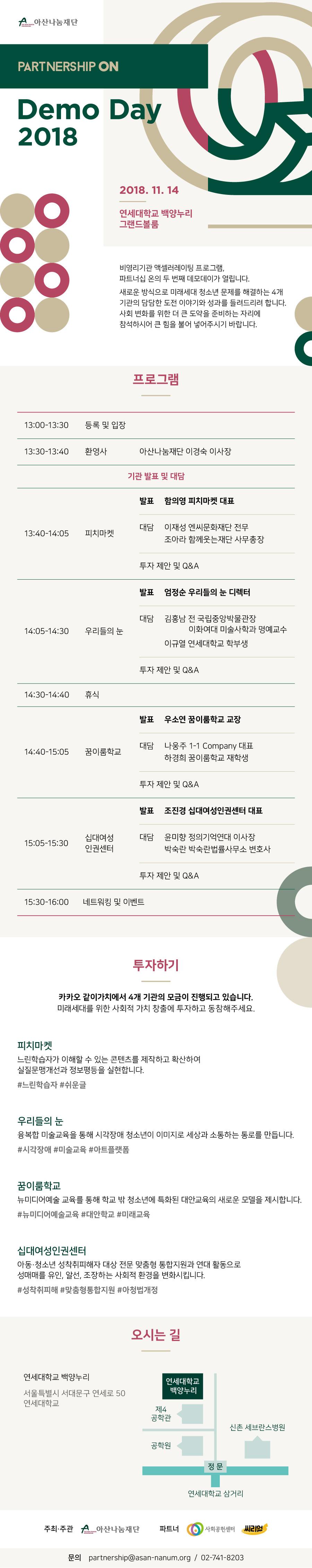 데모데이는 비영리기관 엑셀러레이팅 프로그램 파트너십 온에서 진행하는 행사로, 청소년 문제를 해결하는 4개 기관이 행사에서 성과를 발표하였다.
