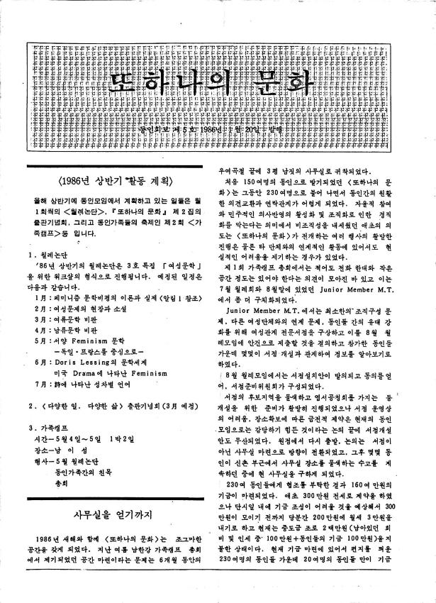 1986년 1월 20일 또 하나의 문화가 발간한 동인회보 5호이다. 동인회보 5호에는 1986년 상반기 동인모임 활동 계획, 사무실 입주 과정, 여성문학 시론 등이 있다. [목차] 1986년 상반기 활동 계획 사무실을 얻기까지 사무실 활동에 거는 기대 12월 월례논단 알림