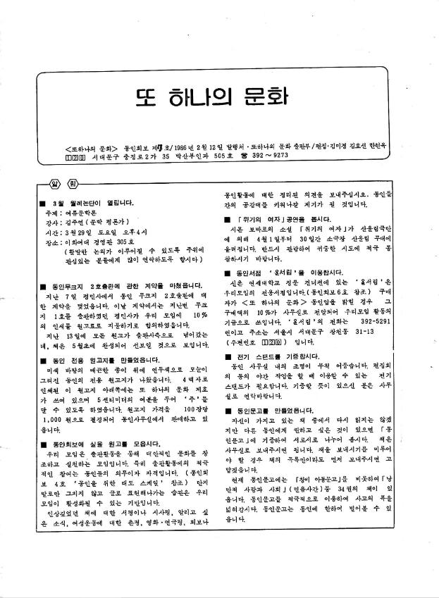 1986년 2월 12일 또 하나의 문화가 발간한 동인회보 7호이다. 동인회보 7호에는 3월 월례논단 공지, 동인회보 원고 모집, 공연 및 동인서점 광고, 여성문제의 현장과 소설 강연 및 토론 내용 요약, 여성계 소식 등이 있다. [목차] 알림 2월 월례논단 여성계 소식 동인 토론의 장 사무실의 동정 영화평 함께 만들어 갑시다.
