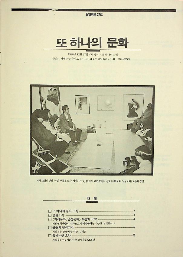 1988년 12월 27일 또 하나의 문화가 발간한 동인회보 27호이다. 동인회보 27호에는 사회전 "우리 봇물을 트자" 소식, 여성해방시 모읍집 동인지 4호 출간 소식, 토론회 요약, 시화전 후기, 10월 월례논단 요약 등의 내용이 있다. [목차] 또 하나의 문화 소식 출판소식 <지배문화, 남성문화>토론회 요약 공동의 인식기반 월례논단 요약
