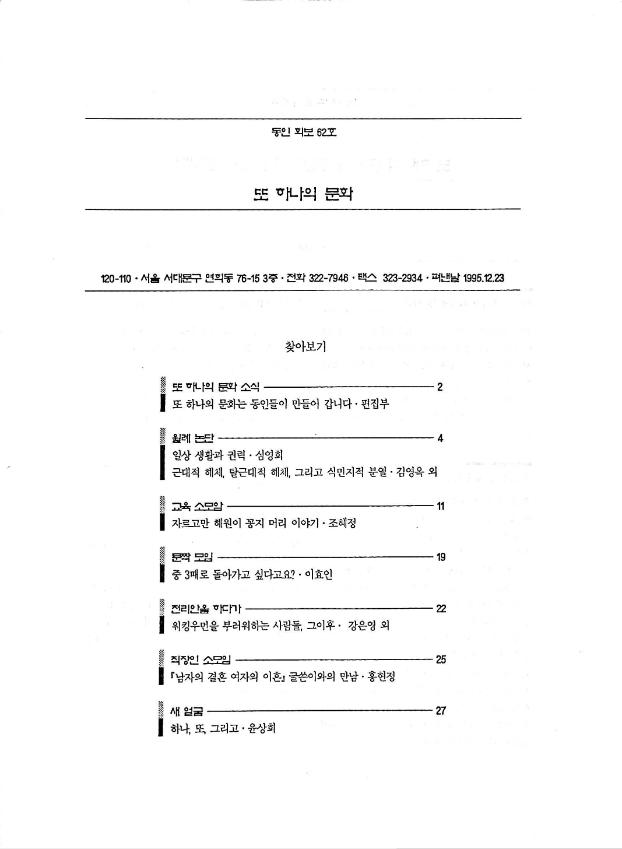 1995년 12월 23일 또 하나의 문화가 발간한 동인회보 62호이다. 동인회보 62호에는 또 하나의 문화 소식, 월례 논단 요약, 교육 소모임, 문짝 모임, 작가와의 만남 등의 내용이 있다. [목차] 또 하나의 문화 소식 월례 논단 교육 소모임 문짝 모임 전리안을 하다가 직장인 소모임 새얼굴