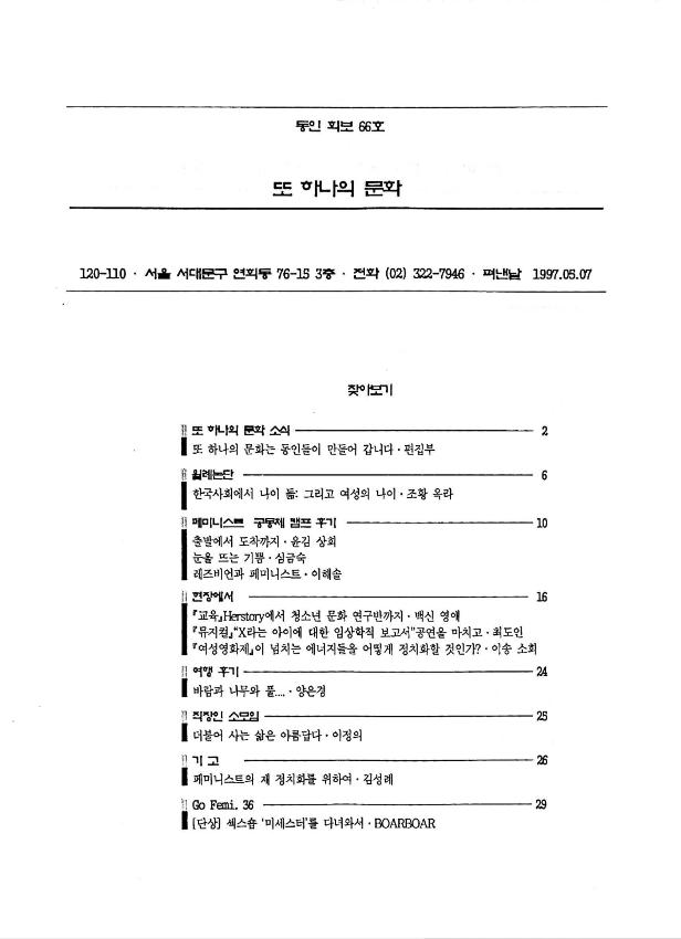 1997년 5월 7일 또 하나의 문화가 발간한 동인회보 66호이다. 동인회보 66호에는 '우물터' 소식, 고정희 시인 6주기 추모 여행 소식, 월례논단 요약, 페미니스트 캠프 후기, 여행 후기, 직장인 소모임 후기, 칼럼 등의 내용이 있다. [목차] 또 하나의 문화 소식 월례논단 페미니스트 공동체 캠프 후기 현장에서 여행 후기 직장인 소모임 기고 Go Femi.36