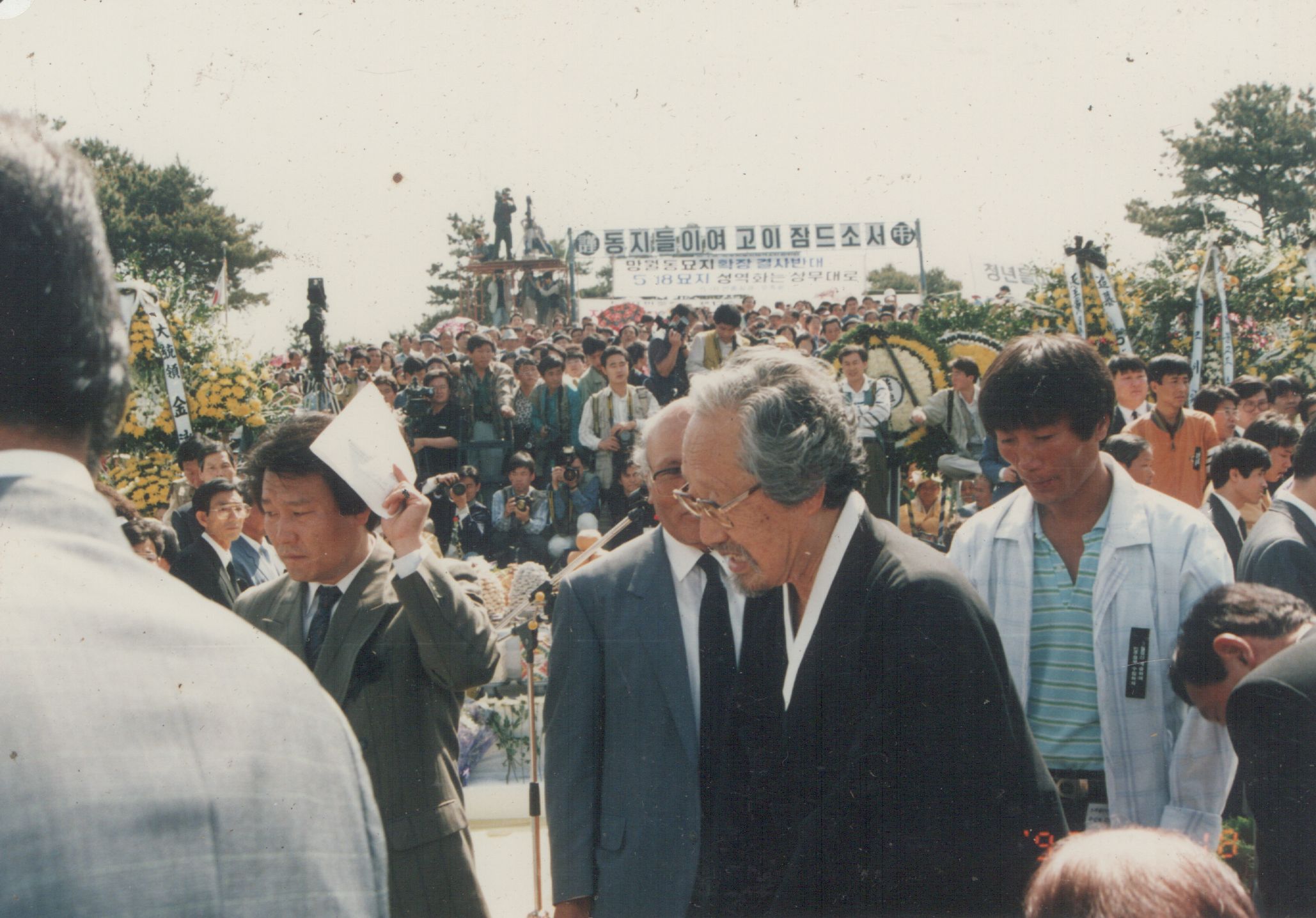 1993년 5월 18일 광주 망월동 5월묘역에서 5·18 민주항쟁 13주기를 맞아 추모제가 열렸다. 오전 10시 5월 단체회원과 시민, 학생 등 1만여 명이 묘역을 가득 메운 가운데 유족들의 오열 속에 추모제가 열렸다. 추모제에 참석한 문익환 목사가 침통한 표정으로 식장으로 걸어가고 있다.