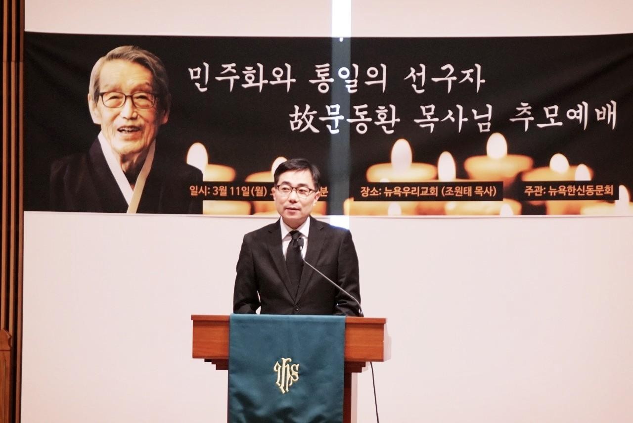 ◇ 문동환 목사 추도예배를 집례하는 뉴욕우리교회 조원태 목사. 조원태 제공
