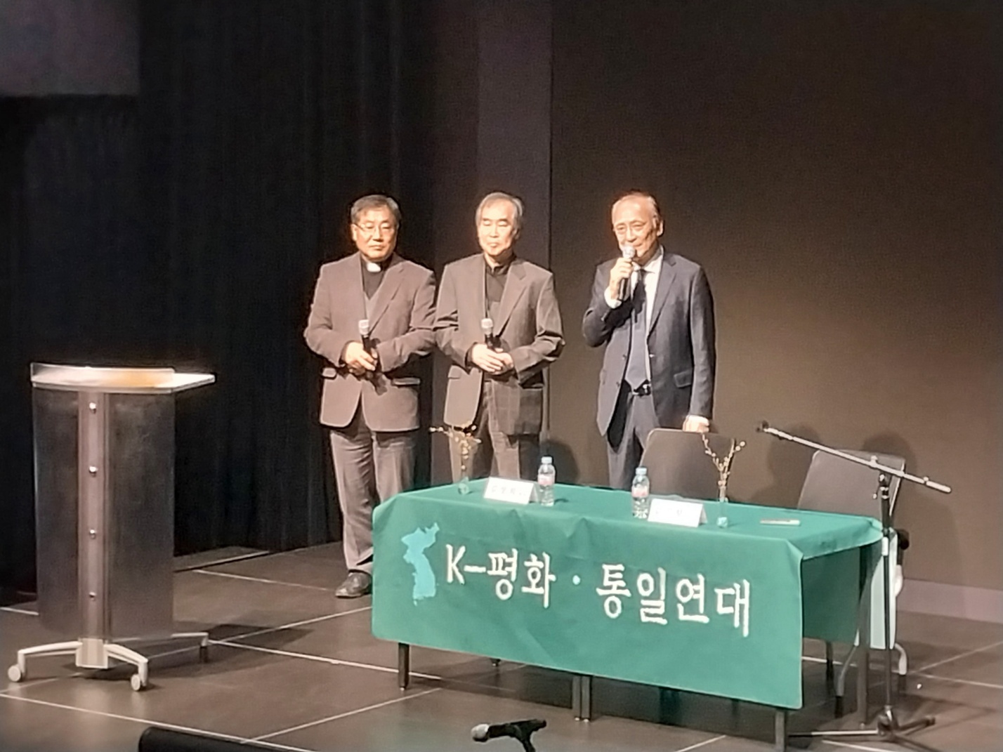◇2024년 4월 2일 K-평화통일연대 첫번째 한반도 평화 심포지엄 무대에 동시에 자리한 송경용 문익환기념사업회 이사장, 장영호 함석헌기념사업회 이사장, 장호권 장준하기념사업회 이사장(왼쪽부터). (김영덕 제공)