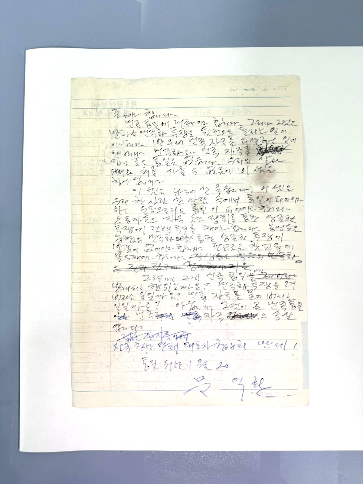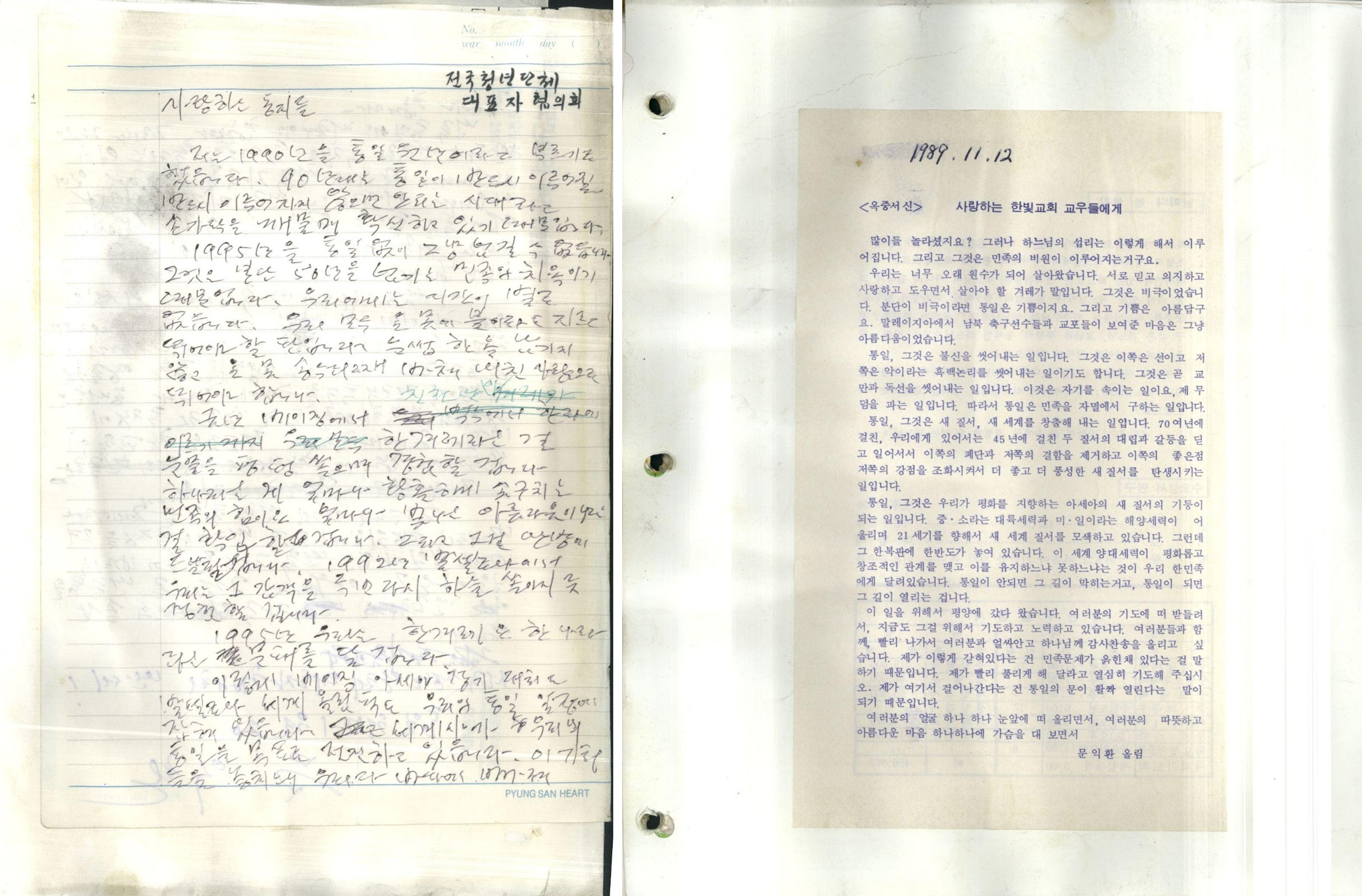 1990년 1월 20일은 전청협 1주년 기념대회에서 박용길 장로가 규탄연설을 맡기로 한 날인데 편지 날짜와 수신인이 일치하는 것으로 보아, 문 목사가 병상에서 전청협 1주년을 축하하고 모인 청년들을 격려하기 위해 글을 썼음을 짐작할 수 있습니다.