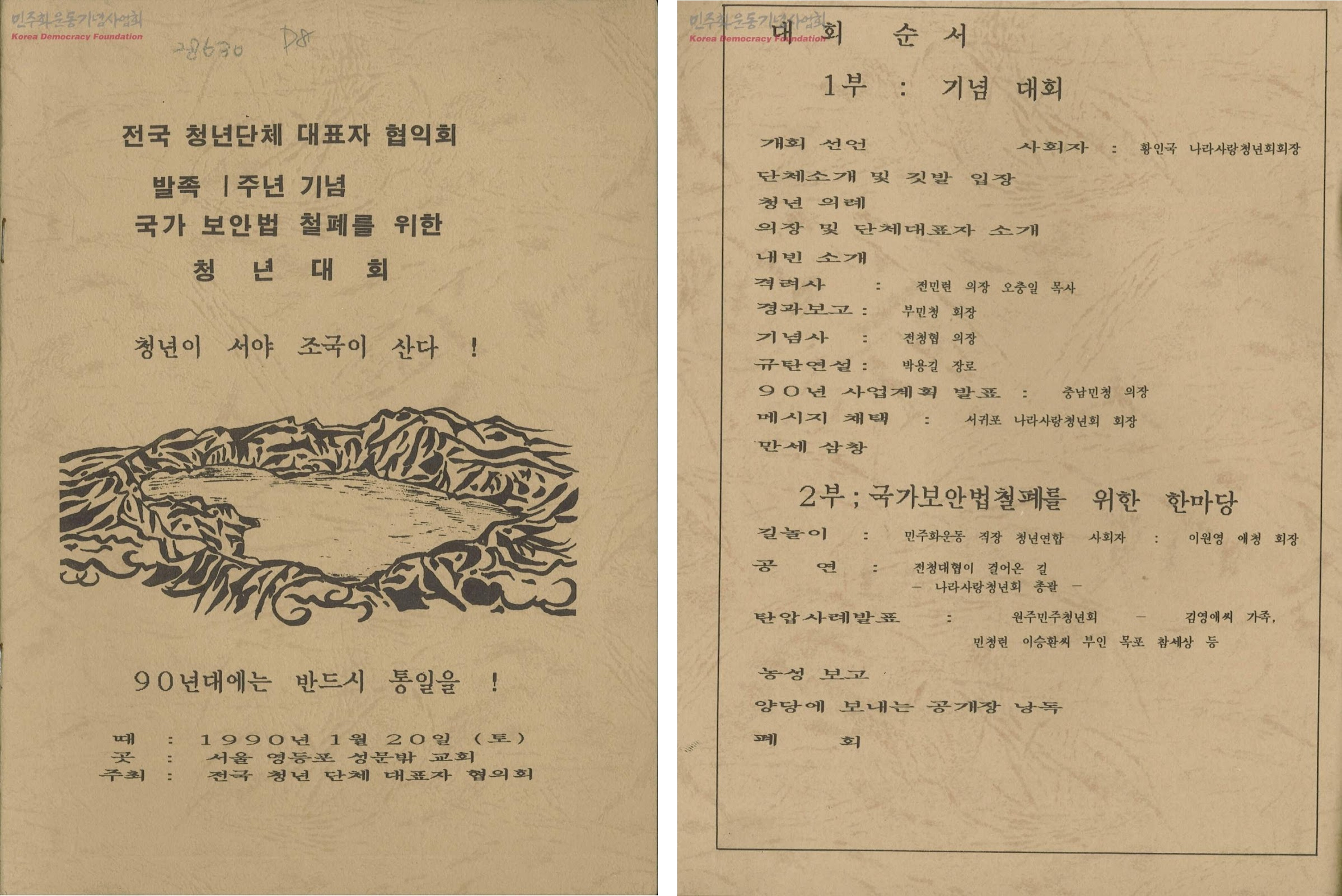 ◇전청협 1주년 기념 청년대회 행사 책자 표지(좌)와 박용길의 규탄연설이 포함된 식순(우)